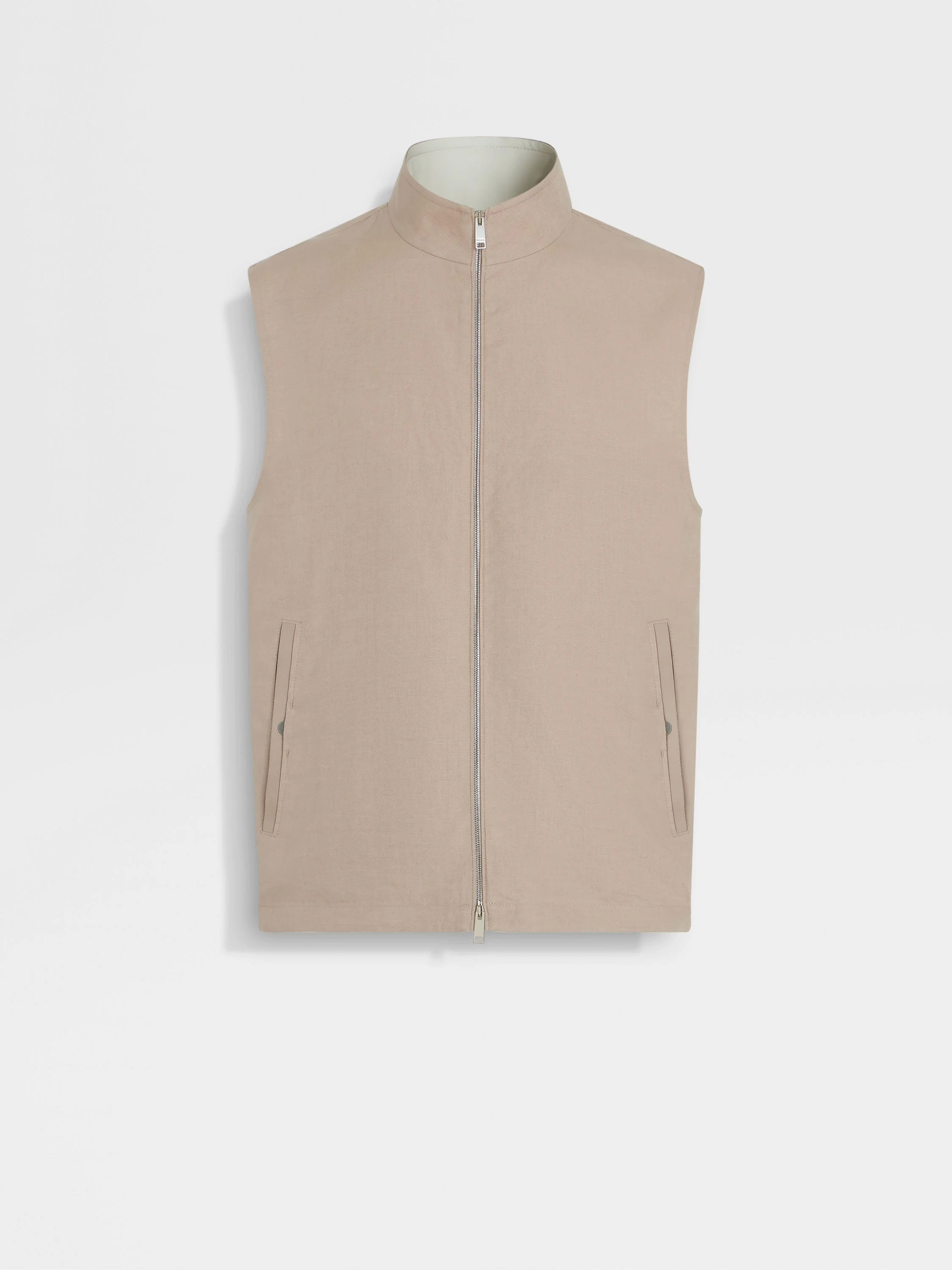 Embrace the natural charm of ZEGNA's Oasi Lino linen with this light taupe vest. INFO Pure linen lends refined charm to a relaxed silhouette with this light taupe Oasi Lino vest, showcasing ZEGNA's sophisticated take on contemporary leisurewear. Its zip-up design with stand collar and snap button pockets is elevated with leather details for a sleek finish. PRODUCT CODE UFT58A9-F137-N02 MATERIALS AND CARE Main body: 100% Linen Leather details: Calf Leather Lining: 100% Polyester The inspiration behind this Oasi Lino garment was Born in Oasi Zegna, a 100km² natural territory and the home of our values. Crafted from European-grown flax fibres that are certified as 100% traceable from 2024, Oasi Lino follows in the footsteps of our founder, who envisioned a vertically integrated system of producing textiles. Do not wash. Do not bleach. Do not tumble dry. Iron at max 110° C. Professional dry cleaning in hydrocarbons, mild process. Professional leather clean only. Protect leather details before washing. Protect the metal accessories during washing. FIT AND PRODUCT DETAILS • Regular fit • Stand collar • Zip closure • Rounded hem • Slanted snap pockets • Leather details • 68 cm length on size 48