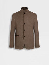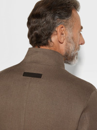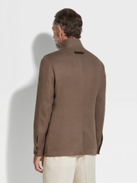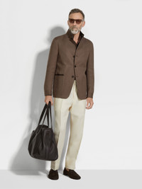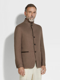 Bring the authentic elegance of pure linen to formal looks with this dark brown Oasi Lino Il Conte chore jacket. INFO Made from our exclusive Oasi Lino fabric, this dark brown Il Conte chore jacket showcases the natural charm of pure linen and Zegna's firm commitment to traceability. Its deconstructed silhouette is styled with a stand collar for a sleek, minimalist look. Finished with a smart single vent and leather accents. Il Conte jacket pays homage to our Founder, Ermenegildo Zegna. He was bestowed the noble title of Count of Monte Rubello for the legacy he created as an entrepreneur, philanthropist and businessman. PRODUCT CODE 973C80A9-1GCKQ0 MATERIALS AND CARE Main body: 100% Linen Leather details: Calf Leather The inspiration behind this Oasi Lino garment was Born in Oasi Zegna, a 100km² natural territory and the home of our values. Crafted from European-grown flax fibres that are certified as 100% traceable from 2024, Oasi Lino follows in the footsteps of our founder, who envisioned a vertically integrated system of producing textiles. Do not wash. Do not bleach. Do not tumble dry. Professional dry cleaning in tetrachloroethene and hydrocarbons, mild process. FIT AND PRODUCT DETAILS • Regular fit • Tailoring chore jacket • Single vent • Stand collar • Leather details • Button closure • Patch pockets • Deconstructed, fused • Lined • 73 cm length on size 48