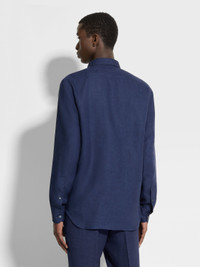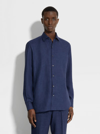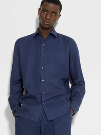 The navy blue Oasi Lino shirt is made from Zegna's exclusive, European-grown flax fibers. INFO The natural texture of pure linen shines in the navy blue Oasi Lino shirt. This lightweight, naturally breathable material connects contemporary leisure looks to a legacy of fine menswear. The Oasi Lino long-sleeve shirt is styled with a one-piece collar and enhanced with hand-stitched details. PRODUCT CODE UDX31A7-SRO3-007 MATERIALS AND CARE 100% Linen The inspiration behind this Oasi Lino garment was Born in Oasi Zegna, our 100km² natural territory and the home of our values. Crafted exclusively from European-grown flax fibres that are certified as 100% traceable by 2024, Oasi Lino follows in the footsteps of our founder, who envisioned a vertically integrated system of producing textiles. Max washing temperature 30°C, mild process. Do not bleach. Do not tumble dry. Iron at max 110°C. Professional dry cleaning in tetrachloroethene and hydrocarbons. FIT AND PRODUCT DETAILS • Regular fit • One-piece collar • Standard cuffs • Button closure • Rounded hem • Hand-stitched details • 79 cm length on size 39