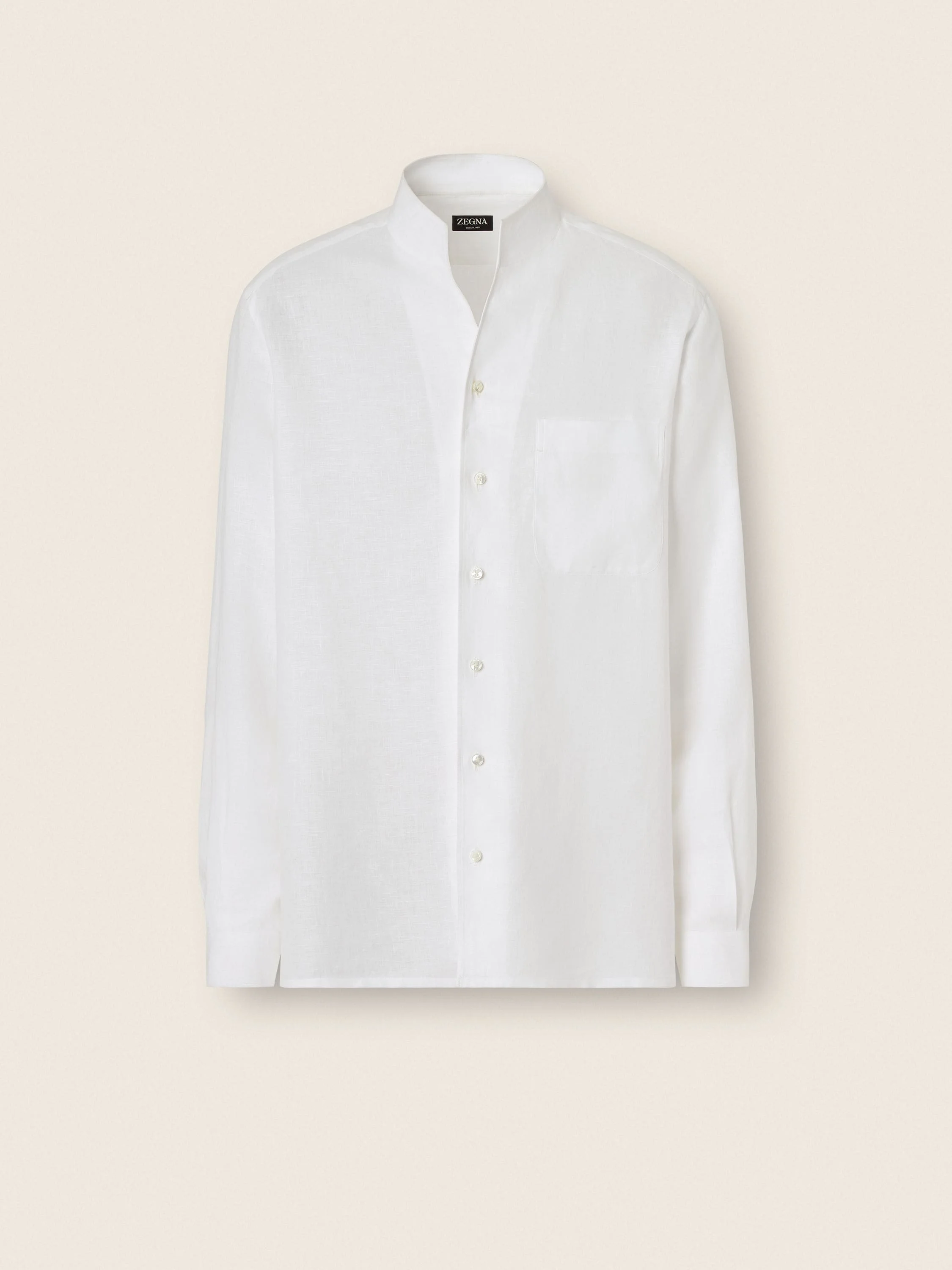This white Oasi Lino shirt in chambray linen captures the quiet elegance of modern tailoring. INFO This Bianco Oasi Oasi Lino shirt reflects ZEGNA’s commitment to understated sophistication, crafted from lightweight chambray in 100% traceable, European-grown linen. The regular fit is elevated by a clean stand collar, standard cuffs, and a chest patch pocket, offering a contemporary take on classic shirting. Bianco Oasi (bja’nko) – ITALIAN FOR 'WHITE', this is the color of our raw wool, crafted in our Lanificio in Oasi Zegna. The tone is identified as a neutral, off-white. PRODUCT CODE UHX31A3-SRG10-014 MATERIALS AND CARE 100% Linen The inspiration behind this Oasi Lino garment was born in Oasi Zegna, a 100km² natural territory and the home of our values. Crafted from European-grown flax fibres that are 100% certified traceable, Oasi Lino follows in the footsteps of our Founder, who envisioned a vertically integrated system of producing textiles. Max washing temp 30°C, mild process. Do not bleach. Do not tumble dry. Iron at max 110°C. Professional dry cleaning in tetrachloroethene and hydrocarbons. FIT AND PRODUCT DETAILS • Regular fit • Stand collar • Standard cuffs • Button closure • Chest patch pocket • Side vents • Chambray • 80 cm length on size 39