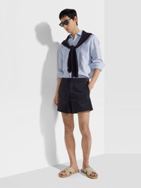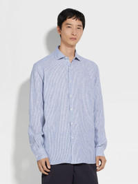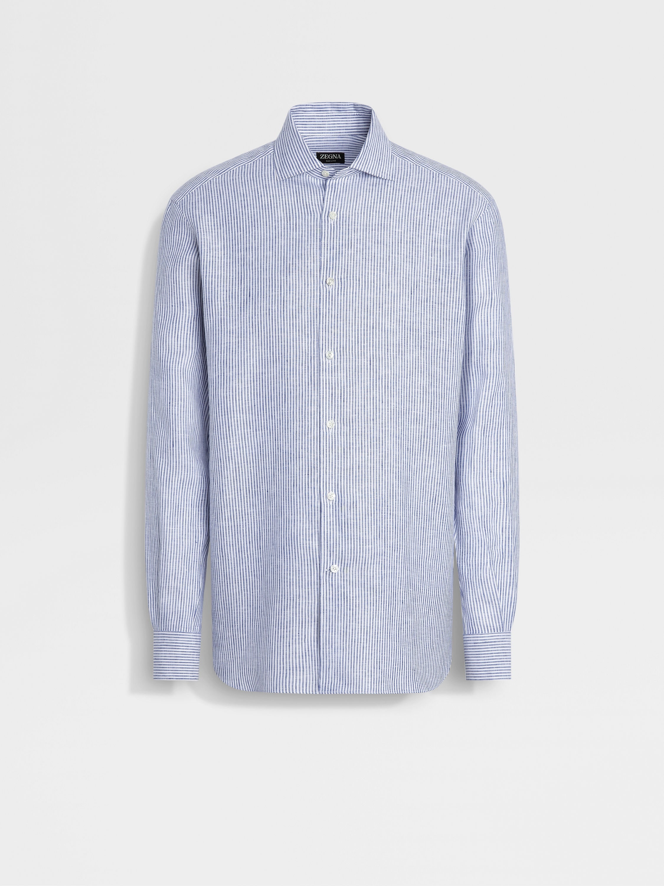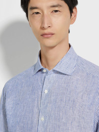 This navy blue and white striped Oasi Lino shirt is made from Zegna's 100% traceable, European-grown linen. INFO This Oasi Lino shirt exudes authentic charm thanks to the distinctive texture of its pure linen weave: soft, breathable, and key for creating elegant warm-weather looks. Its timeless navy blue and white striped design is enriched with hand-stitched detailing. Styled with a semi-spread collar. PRODUCT CODE UFX27A9-SRF7-110 MATERIALS AND CARE 100% Linen The inspiration behind this Oasi Lino garment was Born in Oasi Zegna, a 100km² natural territory and the home of our values. Crafted from European-grown flax fibres that are certified as 100% traceable from 2024, Oasi Lino follows in the footsteps of our founder, who envisioned a vertically integrated system of producing textiles. Max washing temp 30° C, mild process. Do not bleach. Do not tumble dry. Iron at max 110° C. Professional dry cleaning in tetrachloroethene and hydrocarbons. FIT AND PRODUCT DETAILS • Regular fit • Semi-spread collar • Standard cuffs • Button closure • Rounded hem • Striped pattern • Hand-stitched details • 79 cm length on size 39