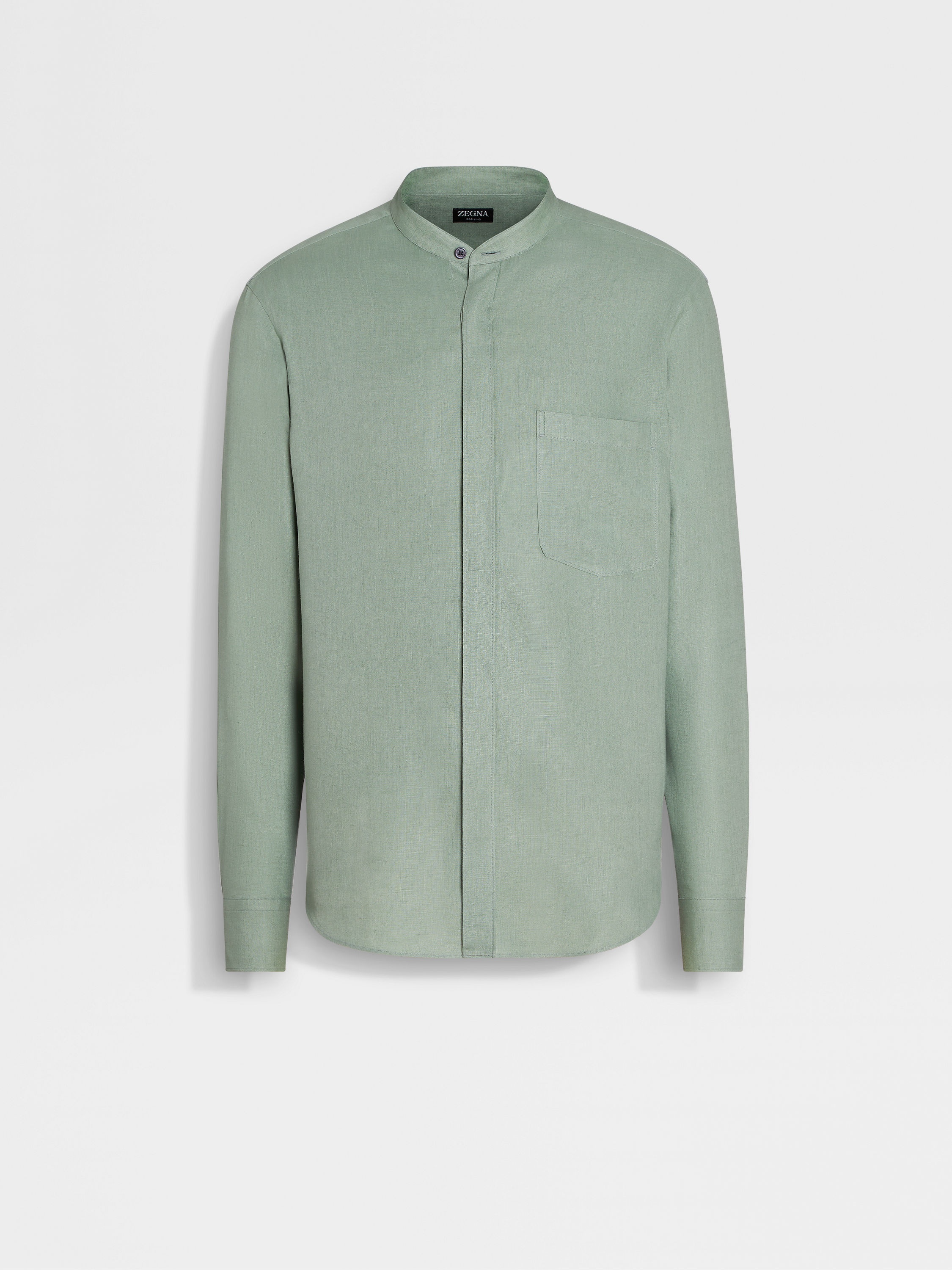 The sage green Oasi Lino shirt is made from Zegna's exclusive, European-grown flax fibers. INFO The natural texture of pure linen shines in the sage green Oasi Lino shirt. This lightweight, naturally breathable material connects contemporary leisure looks to a legacy of fine menswear. Styled with pockets on the chest, the Oasi Lino shirt's concealed button placket and stand collar create a streamlined silhouette. PRODUCT CODE UDX30A7-SRG7-068 MATERIALS AND CARE 100% Linen The inspiration behind this Oasi Lino garment was Born in Oasi Zegna, our 100km² natural territory and the home of our values. Crafted exclusively from European-grown flax fibres that are certified as 100% traceable by 2024, Oasi Lino follows in the footsteps of our founder, who envisioned a vertically integrated system of producing textiles. Max washing temperature 30°C, mild process. Do not bleach. Do not tumble dry. Iron at max 110°C. Professional dry cleaning in tetrachloroethene and hydrocarbons. FIT AND PRODUCT DETAILS • Regular fit • Stand collar • Shirt cuffs • Concealed button closure • Rounded hem • Chest pockets • 78 cm length on size 39 • Model is 187 cm tall (6.1 feet) and wears an Italian size 39.