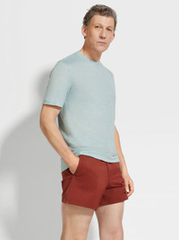 This light blue Oasi Lino T-shirt is made from Zegna's 100% traceable, European-grown linen. INFO The sophisticated texture of pure linen elevates an everyday basic to perfection with this light blue T-shirt, crafted from Zegna's Oasi Lino fabric. Folded trims enrich its timeless crew-neck silhouette for a sleek, streamlined finish. PRODUCT CODE UF352A9-F776-A01 MATERIALS AND CARE 100% Linen The inspiration behind this Oasi Lino garment was Born in Oasi Zegna, a 100km² natural territory and the home of our values. Crafted from European-grown flax fibres that are certified as 100% traceable from 2024, Oasi Lino follows in the footsteps of our founder, who envisioned a vertically integrated system of producing textiles. Do not wash. Do not bleach. Do not tumble dry. Iron at max 110° C. Professional dry cleaning in hydrocarbons, mild process. FIT AND PRODUCT DETAILS • Short sleeves • Crewneck collar • Folded hem and cuffs • Regular fit