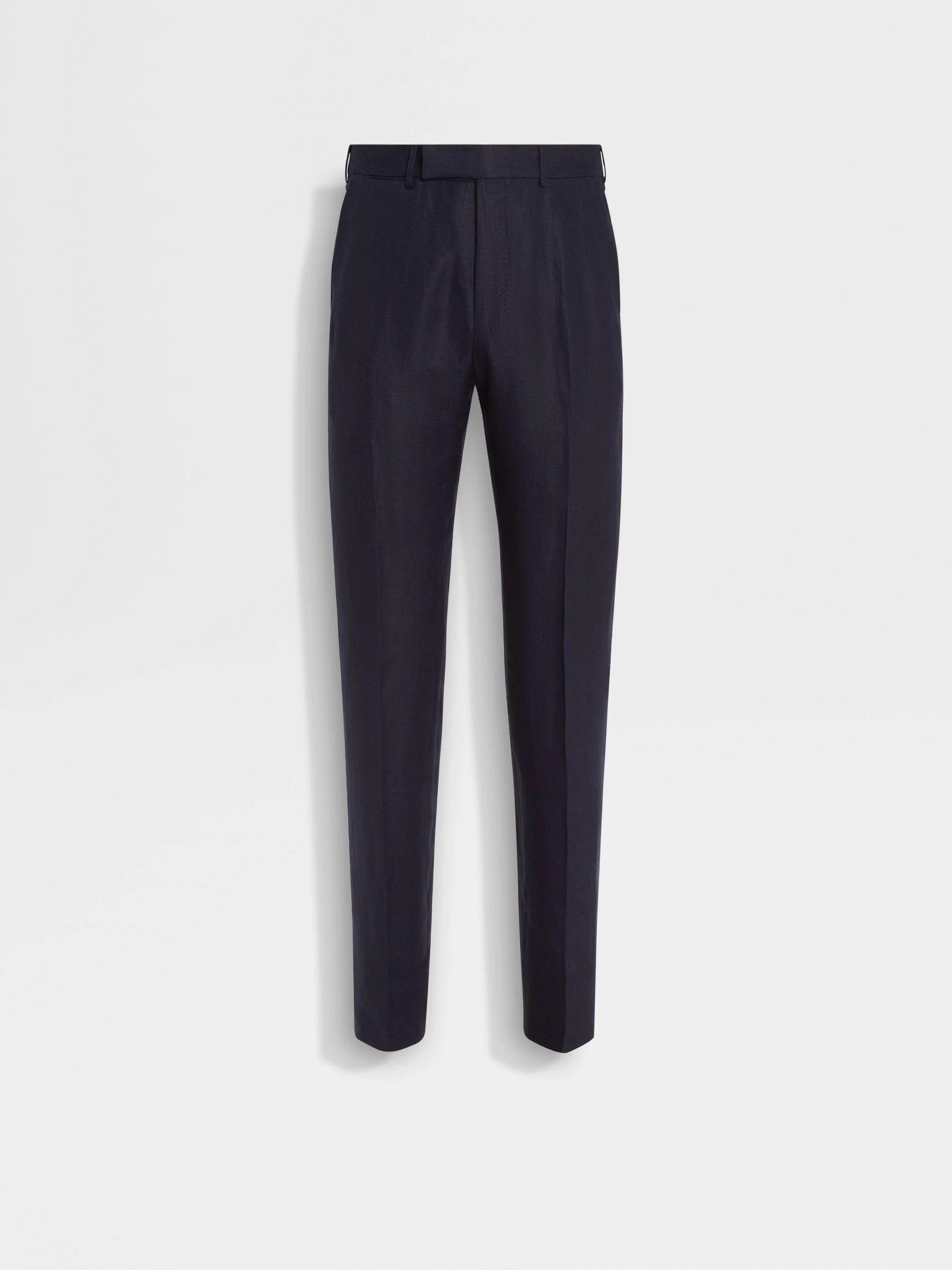 Zegna's exclusive Oasi Lino Blue Flower fabric lends these navy blue pants a unique finish. INFO These pants elevate a timeless navy blue colorway with the frosted effect of Zegna's Oasi Lino Blue Flower fabric, spun from ultra-fine pure linen fibers. Their slim-fit silhouette is styled with an understated flat front and slanted pockets. PRODUCT CODE 973F02A9-75N5N2 MATERIALS AND CARE 100% Linen Oasi Lino Blue Flower is inspired by the rare and short-lived blooms of the flax plant. It's crafted exclusively from exceptionally fine European linen, which imbue it with impeccable smoothness and a unique frosted appearance. Made exclusively from fibres that are 100% traceable from 2024, Oasi Lino follows in the footsteps of our founder, who envisioned a vertically integrated system of producing textiles. Do not wash. Do not bleach. Do not tumble dry. Professional dry cleaning in tetrachloroethene and hydrocarbons, mild process. FIT AND PRODUCT DETAILS • Slim fit • Tailoring pants • 19 cm hem • Hook, zip and button closure • Slanted pockets • Flat front style Pants hems are unfinished. You can bring your pants to our boutiques for alterations.
