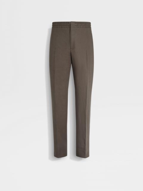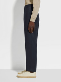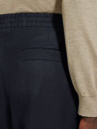 These navy blue Oasi Lino pants feature a drawstring waist for effortless comfort. INFO These navy blue pants exude authentic charm through the natural texture of their pure linen weave, crafted from Zegna's fully traceable Oasi Lino fabric. An elasticated waist with inner drawstring imbues comfort into their sleek flat-fronted silhouette. PRODUCT CODE UFI35A9-TZ32-B09 MATERIALS AND CARE Main body: 100% Linen Lining: 100% Cupro The inspiration behind this Oasi Lino garment was Born in Oasi Zegna, a 100km² natural territory and the home of our values. Crafted from European-grown flax fibres that are certified as 100% traceable from 2024, Oasi Lino follows in the footsteps of our founder, who envisioned a vertically integrated system of producing textiles. Do not wash. Do not bleach. Do not tumble dry. Iron at max 110° C. Professional dry cleaning in hydrocarbons, mild process. Wash inside out. FIT AND PRODUCT DETAILS • Regular fit • 22 cm open hem • Hook, zip and button closure • Stand pockets • Flap pockets on the back • Flat front style • Elasticated waistband with inner coulisse