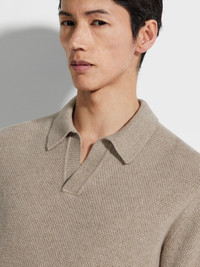 The light taupe melange Oasi Cashmere polo shirt highlights one of Zegna's most exclusive materials with a textured, English rib knit. INFO Superfine cashmere fibers complement the light taupe melange Oasi Cashmere polo shirt's soft, heathered colorway. In keeping with the brand's vision of relaxed luxury, the long-sleeve polo shirt is topped off with an open polo collar. Ribbed trim completes the look. PRODUCT CODE UEK85A8-131-N92 MATERIALS AND CARE 100% Cashmere The inspiration behind this Oasi Cashmere Collection garment was Born in Oasi Zegna, our 100km² natural territory and the home of our values. It's crafted from Oasi Cashmere fibres, which ZEGNA commits to certifying as traceable from 2024. The Oasi Cashmere Collection follows in the footsteps of our founder, who envisioned a vertically integrated system of producing textiles. Wash by hand. Do not bleach. Do not tumble dry. Flat drying. Iron at max 110°C. Professional dry cleaning in hydrocarbons, mild process. Wash and iron inside out. FIT AND PRODUCT DETAILS • English rib stitch • 8 gauge • Open polo collar • Ribbed trims • Long sleeves
