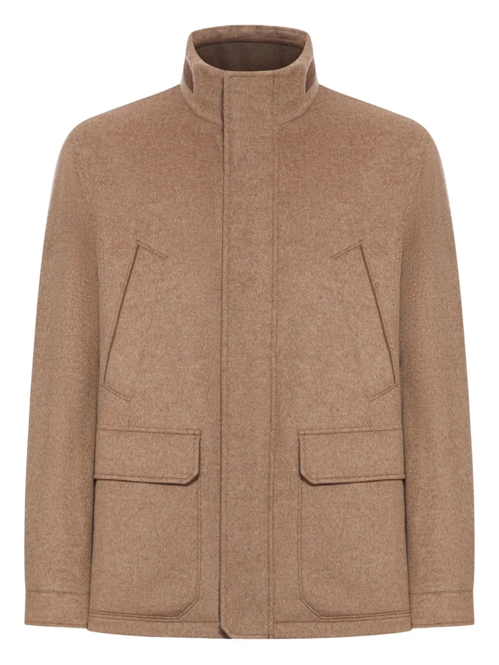 high-neck coat Highlights - Dark beige - High neck - Zip and button fastening - Leather details - Chest welt pockets - Front flap pockets Made in Italy Composition Outer: Cashmere 100%, Calf Leather 100% Lining: Wool 100%, Polyester 100% Washing instructions Read Manufacturer Guidelines