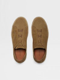 The olive green suede Triple Stitch™ espadrilles elevate casual footwear. INFO A lighter version of Zegna's iconic sneakers, the olive green suede Triple Stitch™ espadrilles combine an unexpected mix of materials to create a chic look. Underneath the rich suede, the espadrilles' iconic roped midsoles are paired with lightweight rubber soles. Their signature triple-crossed elastics keep them secure while evoking the traditional hand-stitching of tailored jackets, a tribute to the brand's legacy. Customize these sneakers with our Made to Measure Service. For more information, please contact our Customer Care or visit your nearest stores. PRODUCT CODE LHCSR-S5970Z-LCH MATERIALS AND CARE Suede Protect from moisture and do not place near direct sources of heat. Clean with a brush designed for use with suede. Avoid contact with cosmetics, perfumes and hand lotions and sanitizers. Store in a cool, dry, well-ventilated place. Stow in the included dust bag when not in use. FIT AND PRODUCT DETAILS • Reversed suede • Crossing elastics • Stitched jute rope around midsole • Rubber sole • Sanitized® removable footbed • Made in Italy • Comes with a shoe bag We want every pair of Triple Stitch™ sneakers to fit perfectly anytime, anywhere, anyplace. To find your perfect fit, we recommend going down a half-size compared to your usual shoe size. Please note that Zegna uses UK sizing. For further information, please contact us via our customer service channels or by visiting the nearest Zegna flagship store.