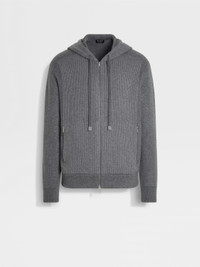This full-zip hoodie is made from grey melange Oasi Cashmere: the definition of luxury leisurewear. INFO This grey melange full-zip hoodie elevates the leisurewear staple with ZEGNA's vision of quiet luxury and the natural charm of Oasi Cashmere. Its cozy yet refined silhouette is ribbed with a jacquard knit and elevated with zip pockets to keep your essentials close. PRODUCT CODE UGK69A2-177-301 MATERIALS AND CARE 100% Cashmere The inspiration behind this Oasi Cashmere collection garment was born in Oasi Zegna, a 100km² natural territory and the home of our values. It's crafted from Oasi Cashmere fibres, made with 100% certified traceable fibres. The Oasi Cashmere collection follows in the footsteps of our Founder, who envisioned a vertically integrated system of producing textiles. Wash by hand. Do not bleach. Do not tumble dry. Flat drying. Iron at max 110°C. Professional dry cleaning in hydrocarbons, mild process. Wash and iron inside out. Protect leather details before washing. FIT AND PRODUCT DETAILS • Regular fit • Ribbed jacquard stitch • 12 gauge • Hooded collar • Long sleeves • Milano stitch hem and cuffs • Zip closure • Stand zip pockets