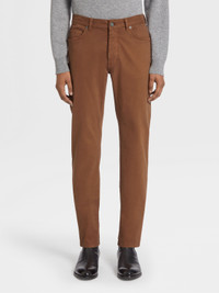 For especially elegant casual wear, the Roccia jeans are made from smooth, Foliage-colored stretch cotton gabardine. INFO Presented in Zegna's signature shade of Foliage, stretch cotton gabardine gives the Roccia jeans an extra smooth finish. The straight fit transitions easily from weekends to casual meetings, ideal for fast-paced contemporary lifestyles. The inspiration for the Roccia Jeans, Roccia the Italian word for 'Rock', was Born in Oasi Zegna — the home of our values in the Italian Alps. Inspired by classic workwear, they're both hardwearing and elegant, making them a reliable foundation to any look. PRODUCT CODE E8PZW-GAN-VIC MATERIALS AND CARE 98% Cotton; 2% Elastane Machine wash, cold (30°C / 85°F), gentle or delicate. Do not bleach. Do not dry clean. Do not tumble dry. Dry in shade. Regular ironing, steam or dry, may be performed at low setting (110°C / 230°F). FIT AND PRODUCT DETAILS • Straight fit • 19 cm hem • Button closure • 5-pocket style • Garment dyed