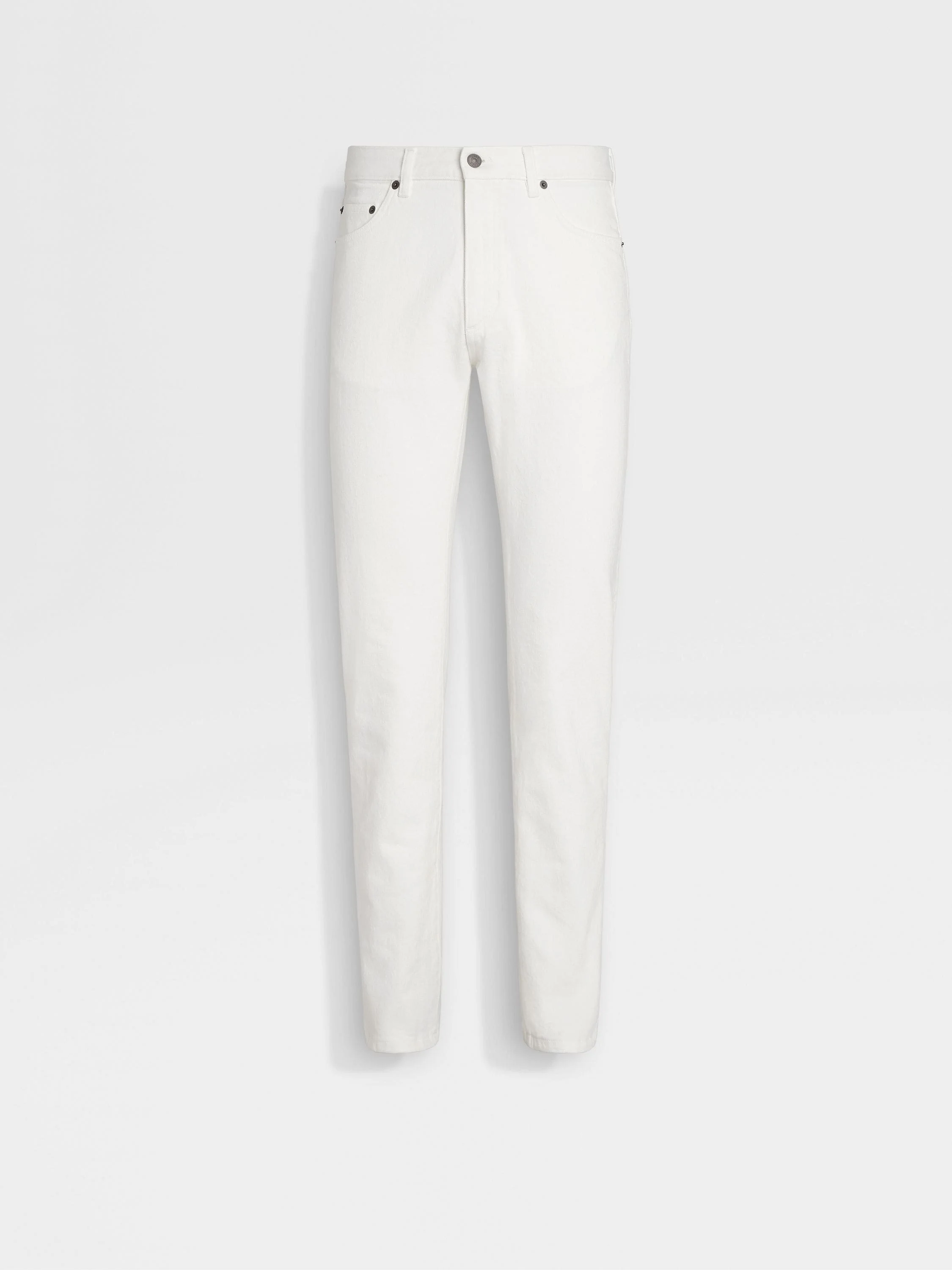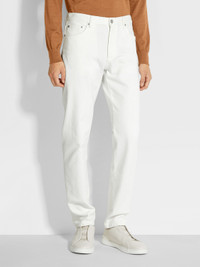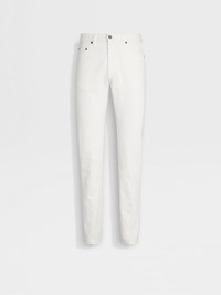 The white rinse-washed stretch cotton Roccia jeans have a chic, slim fit. INFO Enhanced with a touch of stretch for added comfort, the white rinse-washed stretch cotton Roccia jeans move with you throughout the day. The crisp colorway keeps casual looks sophisticated, while the slim fit creates a long, lean silhouette. The inspiration for the Roccia Jeans, Roccia the Italian word for 'Rock', was Born in Oasi Zegna — the home of our values in the Italian Alps. Inspired by classic workwear, they're both hardwearing and elegant, making them a reliable foundation to any look. Customize this item with our Made to Measure Service. For more information, please contact our Customer Care or visit your nearest stores. PRODUCT CODE E8I81-CITY-100 MATERIALS AND CARE Main body: 99% Cotton; 1% Elastane Lining: 65% Polyester; 35% Cotton Max washing temp 30°C, mild process. Do not bleach. Do not tumble dry. Line drying in the shade. Iron at max 110°C. Do not dry clean. Wash separately. Wash inside out. FIT AND PRODUCT DETAILS • Slim fit • 17.5 cm narrow hem • Button closure • 5-pocket style • Rinse wash • Denim weight: 9.5 ounces • Model is 188 cm tall (6.2 feet) and wears a UK size 32.