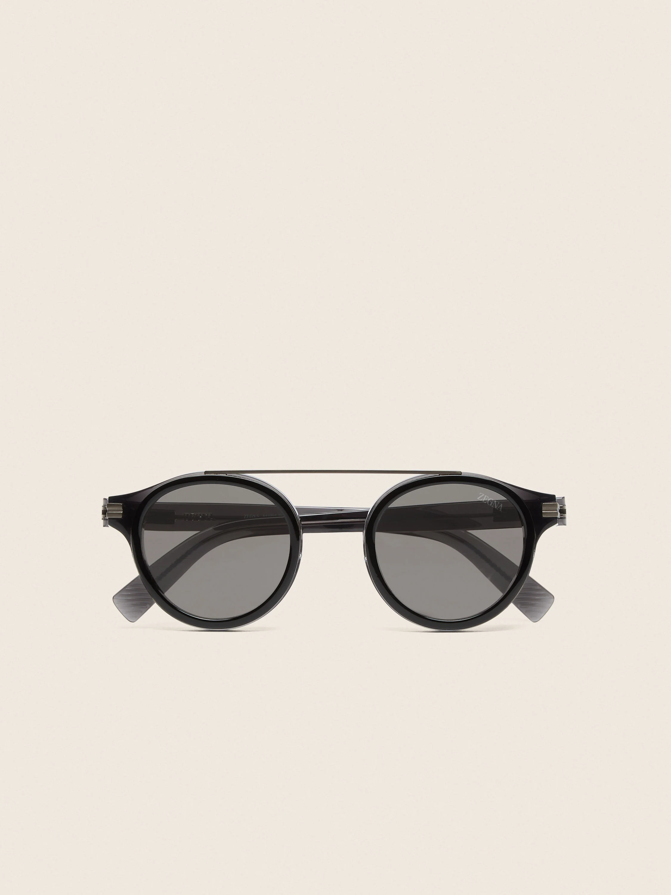 These transparent grey acetate sunglasses embody a refined blend of vintage inspiration and contemporary precision. INFO These transparent grey acetate sunglasses are distinguished by a bold bridgeless silhouette, elevated by a high top metal bar and an engraved double-circle metal detail on the front. Smoke polarized lenses offer clarity and protection, while grip paddles at the temple tips ensure a secure, comfortable fit. Finished with the laser-inscribed ZEGNA Logo on the lens and the palladium 232 Road Brand Mark on the temples, enhanced by a special metal treatment, they reflect the Brand’s commitment to refined craftsmanship and modern design. PRODUCT CODE EZ0300-4805D MATERIALS AND CARE Acetate; Metal Clean your eyewear using a soft cloth, preferably microfiber, with water or a mild detergent. To avoid scratching the lenses, never use paper towels or clothing to clean your eyewear. Do not use household detergents or soaps to clean your eyewear; these products will damage the lenses over time. FIT AND PRODUCT DETAILS • Lens 48 mm – Bridge 22 mm – Temple 145 mm • Base 4 • Finishing: matte dark ruthenium and matte satin on the metal trim • Smoke polarized lenses • Suitable for mounting prescription lenses • Bridgeless silhouette with high top metal bar • Laser-inscribed ZEGNA Logo on the lens • Palladium ZEGNA 232 Road Brand Mark on the temples as a corner detail