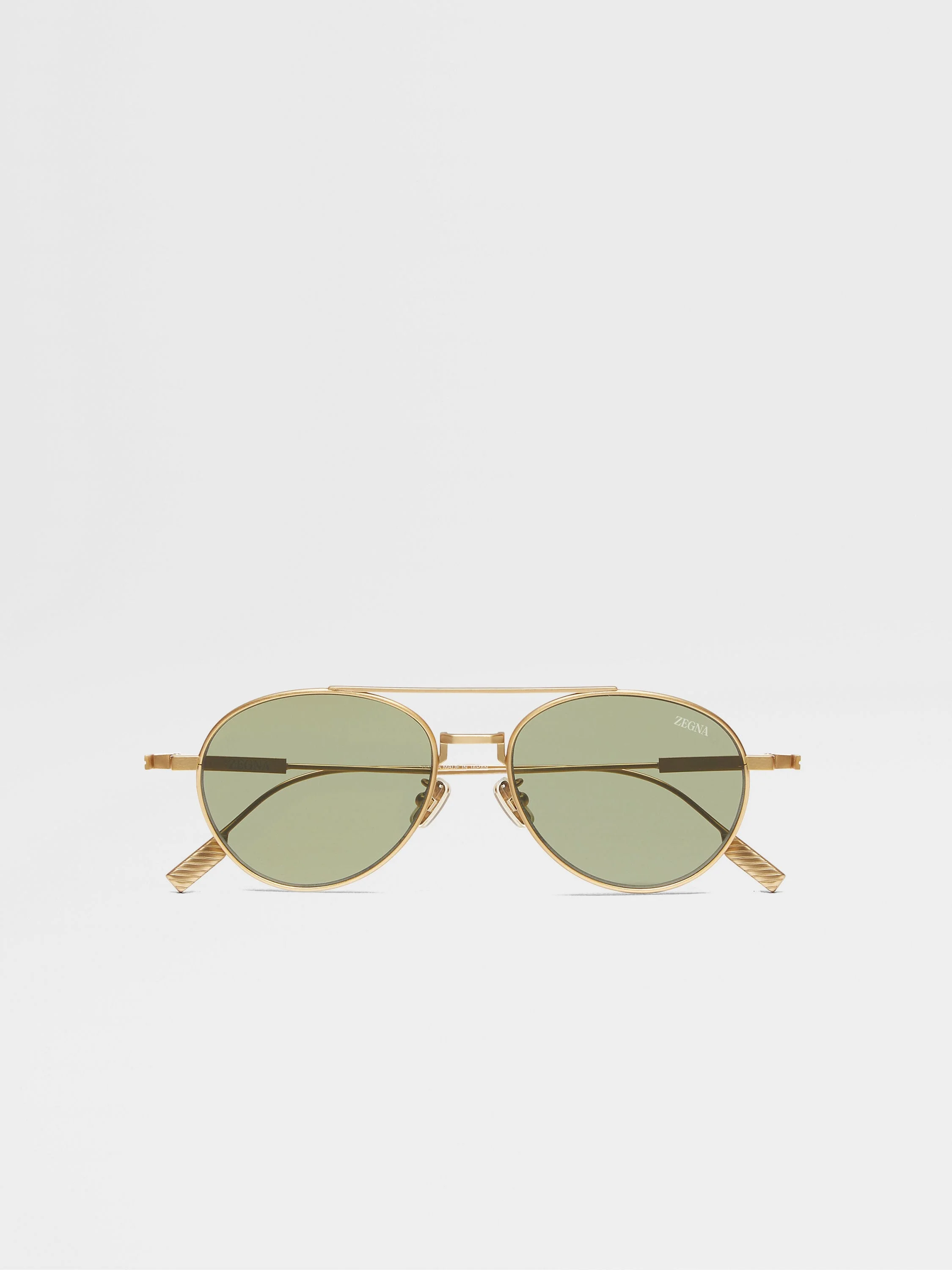 These satin brass aviator sunglasses combine style with functionality, made from lightweight titanium. INFO Styled with a characteristic double bridge, these aviator-style sunglasses are a masterpiece of modern style and functionality. Crafted from lightweight titanium in a satin brass finish, they're built with beta-titanium "elbow" temples for enhanced flexibility. Fitted with green lenses, adjustable gunmetal nosepads and high-grip paddle tips. PRODUCT CODE EZ0288-5535N MATERIALS AND CARE Full Titanium Clean your eyewear using a soft cloth, preferably microfiber, with water or a mild detergent. To avoid scratching the lenses, never use paper towels or clothing to clean your eyewear. Do not use household detergents or soaps to clean your eyewear; these products will damage the lenses over time. FIT AND PRODUCT DETAILS • Lens 55 mm – Bridge 17 mm – Temple 155 mm • Base 2 • Finishing: matte • Not suitable for mounting prescription lenses • Double bridge • Green lenses • Grip paddle on the end of the temples • Beta-titanium temples • Adjustable gold nosepads • ZEGNA 232 Road Brand Mark on the temples as a corner detail • ZEGNA Logo on the lens and on the inner side of the temples