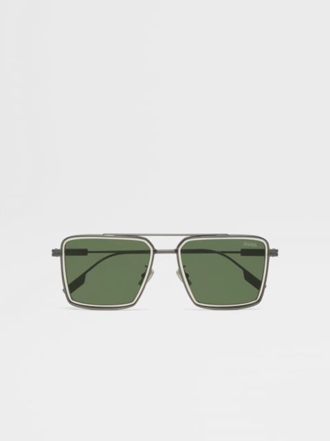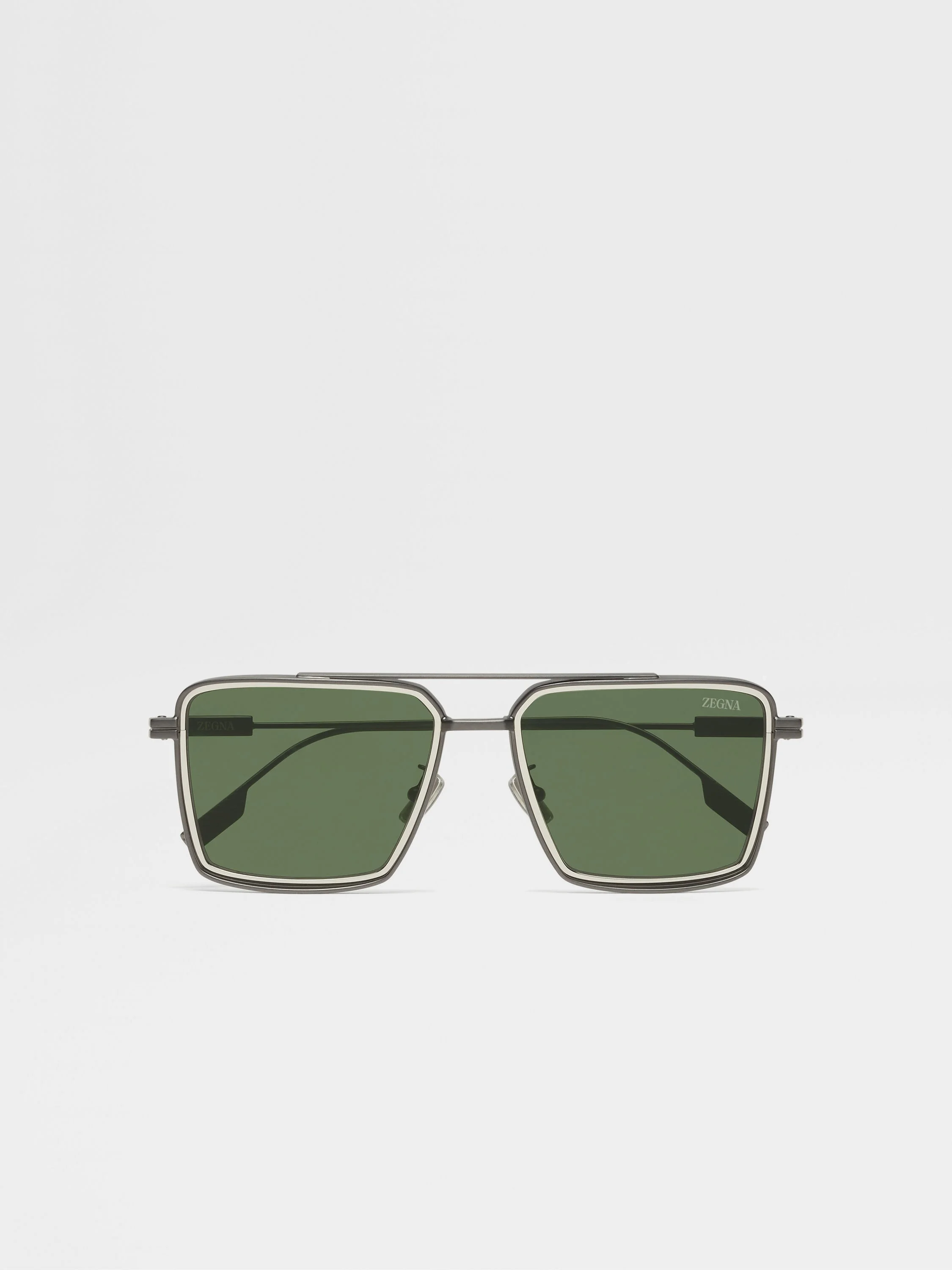 The satin gunmetal metal sunglasses are a modern take on the classic navigator style, defined by sleek design elements. INFO The satin gunmetal metal sunglasses showcase a navigator style made entirely of metal. These frames feature a distinctive double metal profile at the front, complemented by a sleek double-bridge design for stylish structure. The temples are fitted with grip paddles at the tips to ensure a stable fit. The sunglasses are further refined with Zegna nose pads and the Zegna 232 Road Brand Mark at the temple tips. PRODUCT CODE EZ0257-5609R MATERIALS AND CARE Full Metal Clean your eyewear using a soft cloth, preferably microfiber, with water or a mild detergent. To avoid scratching the lenses, never use paper towels or clothing to clean your eyewear. Do not use household detergents or soaps to clean your eyewear; these products will damage the lenses over time. FIT AND PRODUCT DETAILS • Lens 56 mm – Bridge 18 mm – Temple 145 mm • Base 2 • Finishing: matte • Double bridge • Metal rims and temples • Adjustable nose pads with bold Zegna Logo • Chiseled lines on the temple tips