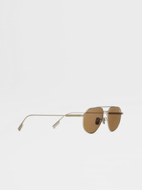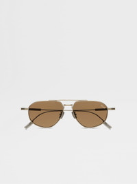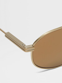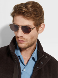 A navigator silhouette and light titanium construction make these satin light bronze sunglasses an everyday hero. INFO Sleek, lightweight and comfortable, these navigator-style sunglasses are a must for modern everyday looks. Crafted from lightweight titanium in a satin light bronze finish, they feel flexible on the face with beta-titanium "elbow" temples and stay put with high-grip paddle tips. Complete with polarized brown lenses and ZEGNA's signature 232 Road Brand Mark detail. PRODUCT CODE EZ0289-5635H MATERIALS AND CARE Full Titanium Clean your eyewear using a soft cloth, preferably microfiber, with water or a mild detergent. To avoid scratching the lenses, never use paper towels or clothing to clean your eyewear. Do not use household detergents or soaps to clean your eyewear; these products will damage the lenses over time. FIT AND PRODUCT DETAILS • Lens 56 mm – Bridge 16 mm – Temple 155 mm • Base 2 • Finishing: matte • Not suitable for mounting prescription lenses • Double bridge • Polarized brown lenses • Grip paddle on the end of the temples • Beta-titanium temples • Adjustable gunmetal nosepads • ZEGNA 232 Road Brand Mark on the temples as a corner detail • ZEGNA Logo on the lens and on the inner side of the temples