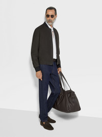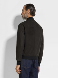 Zegna's supple SECONDSKIN leather elevates this black bomber to luxury status. INFO This black bomber showcases the exceptional beauty of Zegna's SECONDSKIN leather. Its timeless silhouette is styled with classic knitted trims, a zip closure and welt pockets, bringing effortless style to all occasions. PRODUCT CODE UFPNSA9-F189P-K09 MATERIALS AND CARE Calfskin SECONDSKIN is crafted by tanneries selected for their renowned expertise. Fine, supple and incredibly soft to the touch, it moulds to your proportions over time — offering impeccable comfort with each wear. Do not wash. Do not bleach. Do not tumble dry. Iron at max 110°C. Professional dry cleaning in hydrocarbons, mild process. Professional leather clean only. Use press cloth. Avoid prolonged contact with light coloured garments. FIT AND PRODUCT DETAILS • Regular fit • Knit bomber collar • Zip closure • Knit hem and cuffs • Stand welt pockets • 66 cm length on size 48