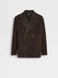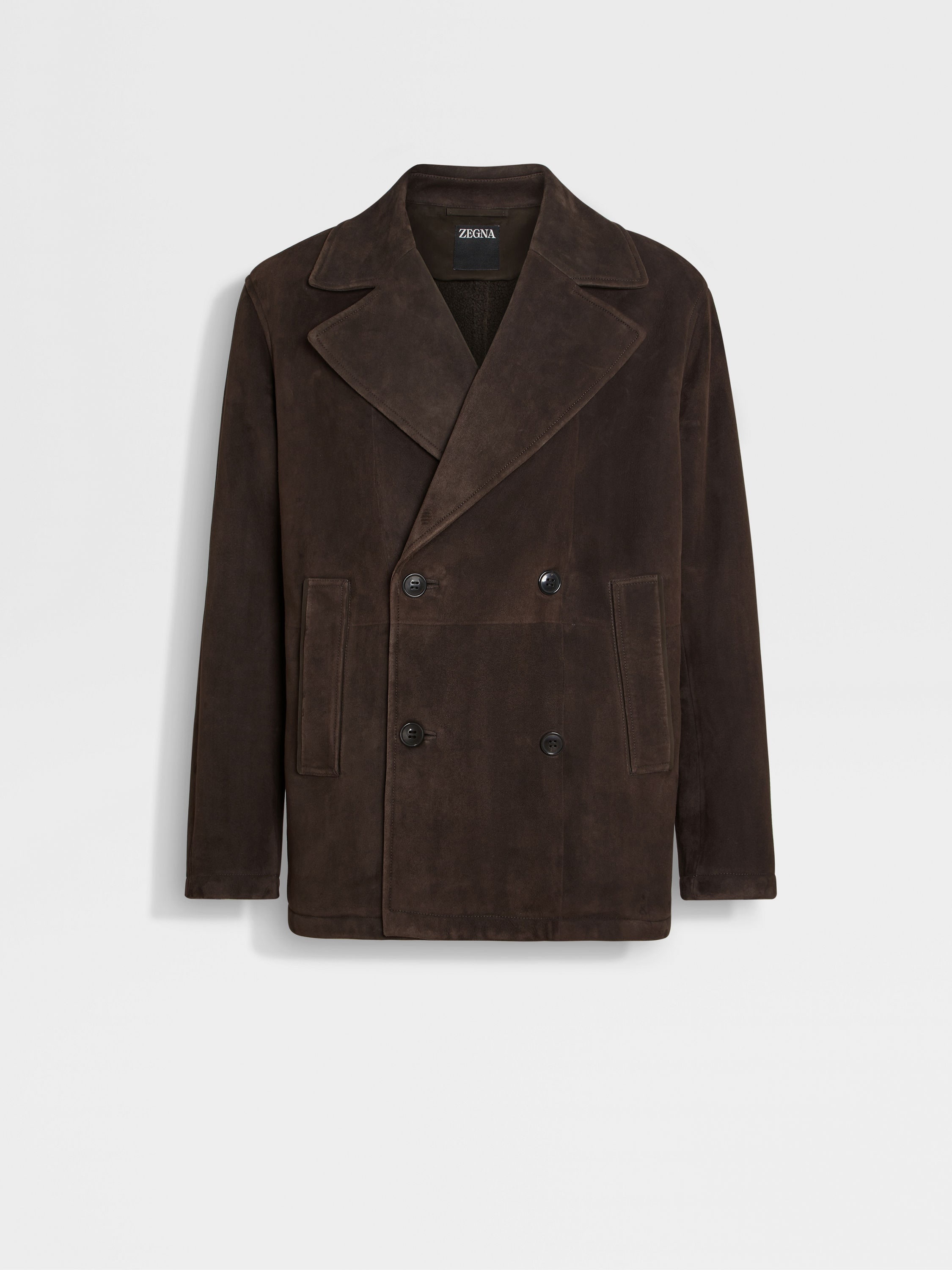 The dark brown shearling wool peacoat makes a statement with its classic, double-breasted front. INFO Drawing on retro inspirations, the dark brown shearling wool peacoat is a timeless addition to any winter wardrobe. The warm material is accentuated with sophisticated calfskin details. It is styled with peak lapels and welt pockets. PRODUCT CODE UEPMPA8-E360P-M09 MATERIALS AND CARE Main body: 100% Shearling Wool Leather details: Calfskin Do not wash. Do not bleach. Do not tumble dry. Iron at max 110°C. Professional dry cleaning in hydrocarbons, mild process. Protect the metal accessories during washing. Professional leather clean only. FIT AND PRODUCT DETAILS • Regular fit • Peak lapels • Button closure • Open hem and cuffs • Welt pockets • 80 cm length on size 48