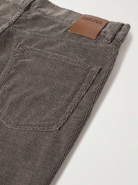ZEGNA's collections feature timeless pieces in subtle colour palettes. These slim-straight trousers have been tailored in Italy from cotton-blend corduroy with a touch of cashmere in a dark shade of anthracite. Small to size. See Size & Fit notes. Size & Fit - Fits small to size. Take one size larger than normal - Slim-straight leg, mid-rise style - Mid-weight, non-stretchy fabric - Italian sizing Details & Care - Anthracite cotton-blend corduroy - Button and zip fastening - 91% cotton, 8% cashmere, 1% elastane; lining: 65% polyester, 35% cotton - Dry clean