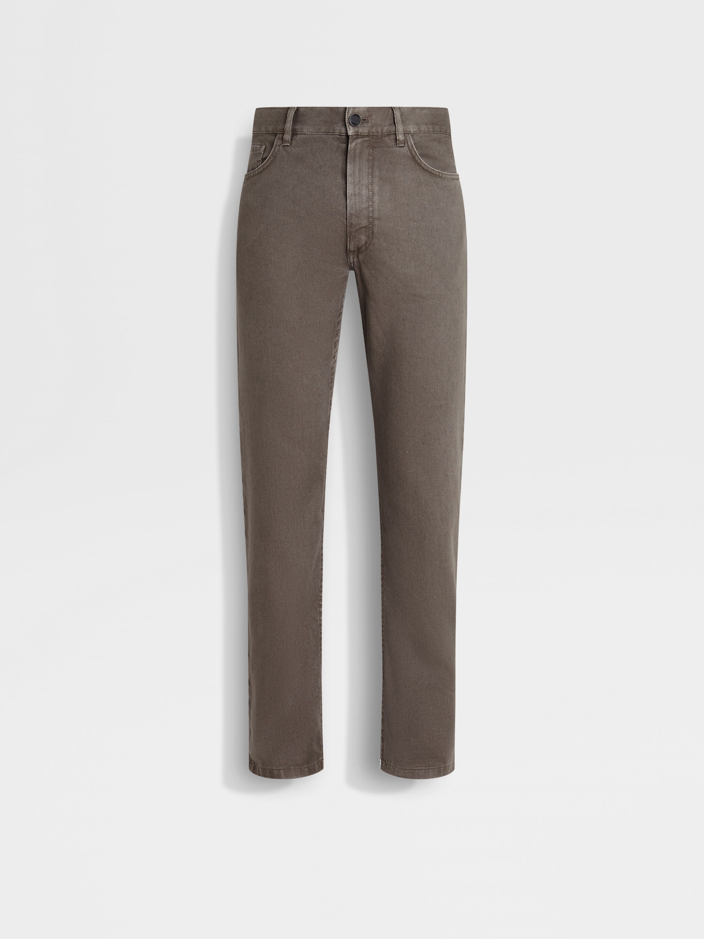 These dark taupe Roccia jeans are made from comfort cotton and linen with a sartorial fly. INFO Comfortable and versatile, these dark taupe Roccia jeans are made from a cotton-linen blend with a hint of stretch for comfort. Their slim-fitting silhouette is elevated with a sartorial fly in line with Zegna's vision of luxury leisurewear. ROCCIA ('rɔt:ʃa) — ITALIAN FOR 'ROCK' The inspiration for the Roccia Trousers was Born in Oasi Zegna — the home of our values in the Italian Alps. Inspired by classic workwear, they're both hardwearing and elegant, making them a reliable foundation to any look. PRODUCT CODE UFL59A9-CITYG-N07 MATERIALS AND CARE Main body: 51% Cotton; 47% Linen; 2% Elastane Lining: 100% Cotton Max washing temp 30° C, mild process. Do not bleach. Do not tumble dry. Line drying in the shade. Iron at max 110° C. Do not dry clean. Wash separately. Wash inside out. FIT AND PRODUCT DETAILS • Slim fit • 18 cm narrow hem • Zip and button closure • 5-pocket style • Garment-dyed • Fabric weight: 400 gr