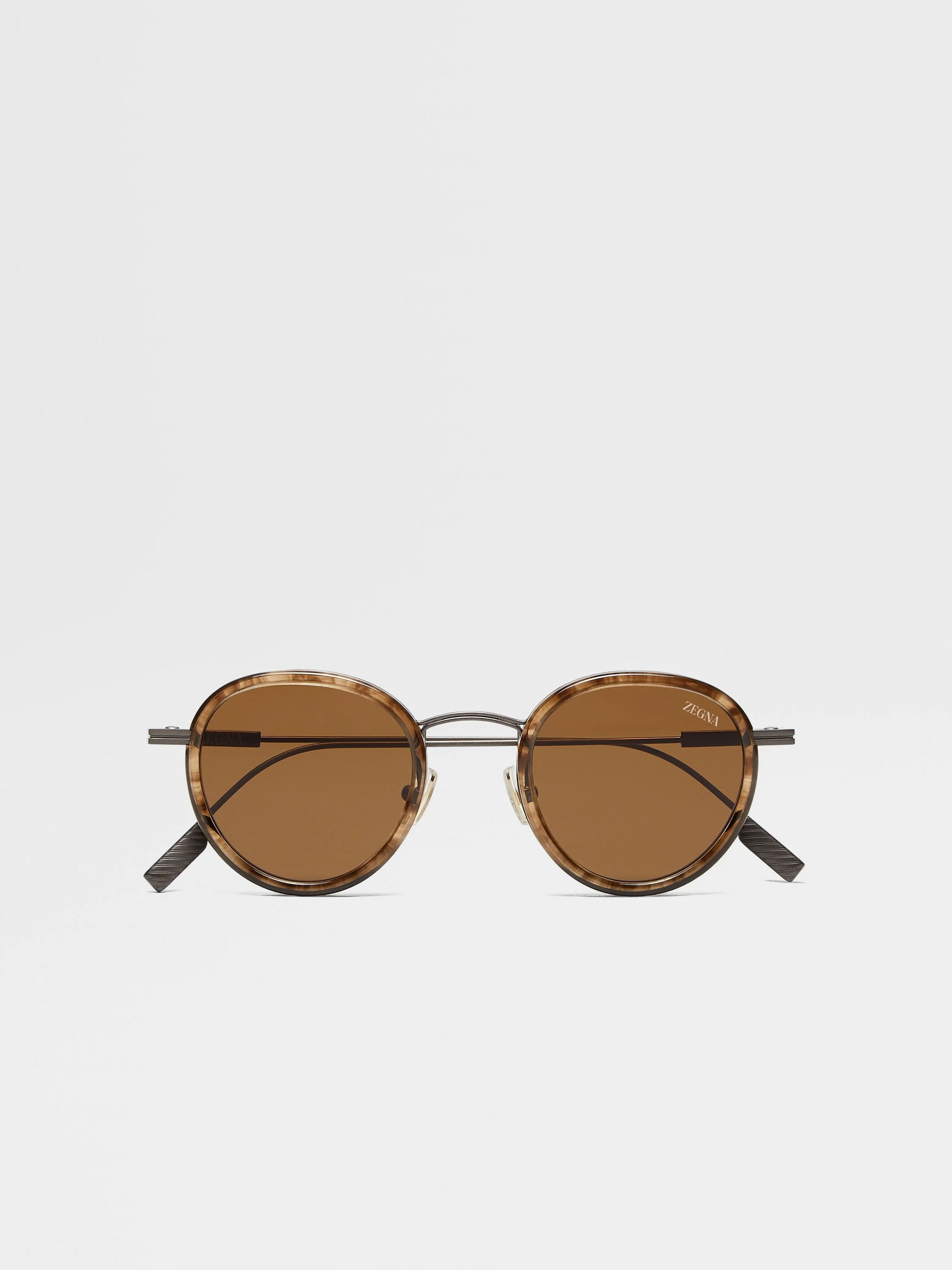 Sleek titanium lets the clean silhouette of these striped havana sunglasses do all the talking. INFO These striped havana sunglasses deliver lightweight comfort with a special construction that draws on the noble properties of flexible titanium: thin metal wire wraps around square-cut acetate with soft rounded volumes. Adjustable nose pads and grip paddles on the temple tips ensure a secure fit, whilst our iconic 232 Road Brand Mark signs off the looks with Zegna's signature elegance. PRODUCT CODE EZ0276-4650E MATERIALS AND CARE Titanium; Acetate Clean your eyewear using a soft cloth, preferably microfiber, with water or a mild detergent. To avoid scratching the lenses, never use paper towels or clothing to clean your eyewear. Do not use household detergents or soaps to clean your eyewear; these products will damage the lenses over time. FIT AND PRODUCT DETAILS • Lens 46 mm – Bridge 23 mm – Temple 145 mm • Base 2 • Finishing: shiny • Single bridge • Laser-inscribed Zegna Logo on the inside of the temple and on the lens • Zegna 232 Road Brand Mark on the temples • Adjustable nose pads