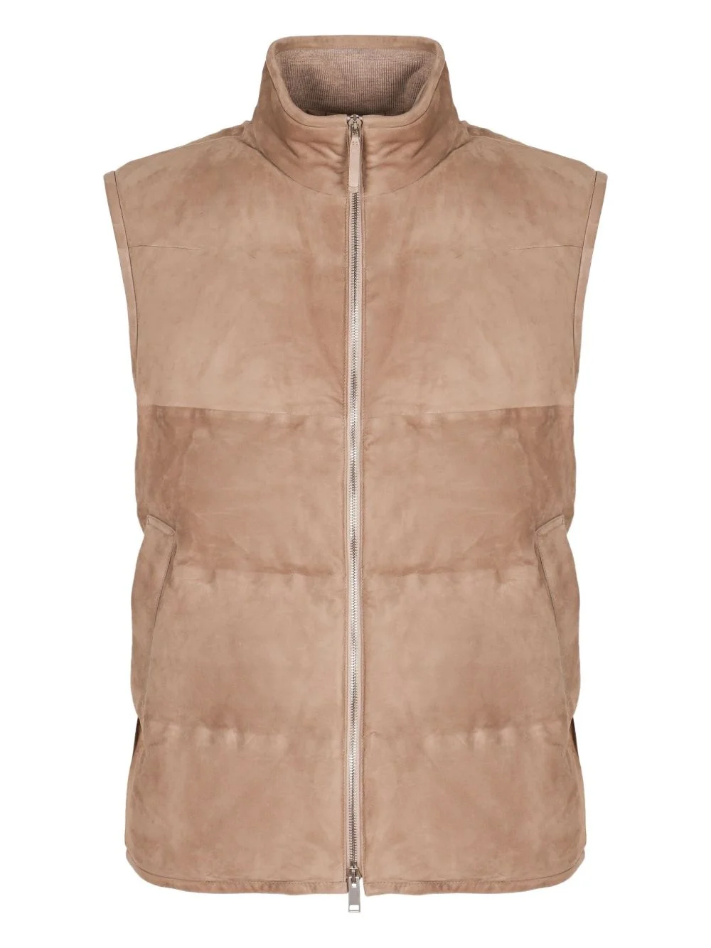 suede gilet Highlights - Sand beige - Front two-way zip fastening - Two side welt pockets - Stand-up collar - Sleeveless Made in Italy Composition Lining: Wool 73%, Polyamide 25%, Elastane 2% Outer: Lamb Suede 100% Washing instructions Read Manufacturer Guidelines