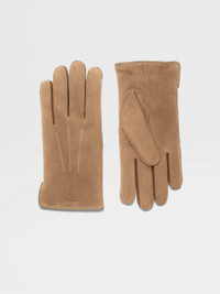The beige suede gloves are made from pure lambskin. INFO Leather piping along the edges of the suede leather gloves highlight their fine construction. These soft beige suede gloves add a final touch of luxury to cold-weather looks. The front of each glove is embossed with the Zegna Logo. PRODUCT CODE Z8G04GA8-G8E-BE1 MATERIALS AND CARE Main body: Suede Leather details: Lambskin Do not wash. Do not bleach. Do not tumble dry. Do not iron. Do not dry clean. FIT AND PRODUCT DETAILS • Leather piping on the edge • Shearling wool lining • Internal Zegna 232 Road Brand Mark on the left • Embossed Zegna Logo on the front • Made in Italy