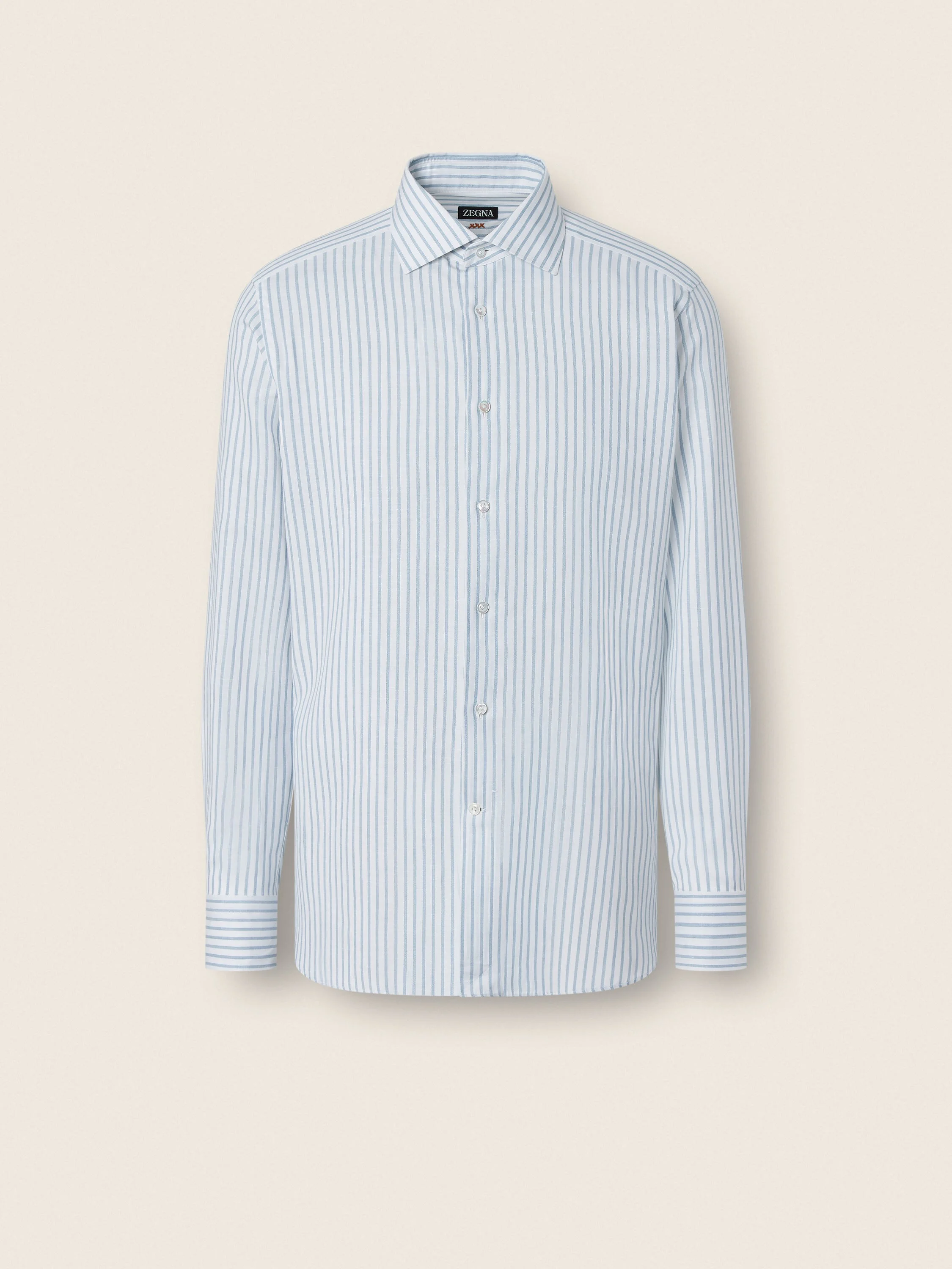 Featuring teal blue and white stripes, this shirt is made from a luxurious blend of cotton, linen and silk. INFO Honoring ZEGNA's legacy of luxury menswear, this teal blue and white striped shirt blends cotton, linen and Mulberry silk for an exceptionally soft feel. Cut in a regular fit with a versatile semi-spread collar and standard cuffs. PRODUCT CODE 302332A3-9NS0AT MATERIALS AND CARE 43% Cotton; 39% Linen; 18% Mulberry Silk Max washing temp 30°C, mild process. Do not bleach. Do not tumble dry. Flat drying. Iron at max 110°C. Do not dry clean. FIT AND PRODUCT DETAILS • Regular fit • Tailoring shirt • Semi-spread collar • Rounded hem • Standard cuffs • Button closure • Striped pattern • Light-weight fusing • 79 cm length on size 39