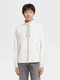 The white and grey technical fabric reversible Brezza blouson is lightweight and versatile. INFO The white and grey technical fabric reversible Brezza blouson combines sleek, urban style with functional design. Choose between the microfiber and cashmere blend jersey sides to complement different looks. The water-repellent jacket is styled with a stand collar and adjustable hem to block out the wind, while leather details add polish wherever you go. PRODUCT CODE E7T33-7124B-997 MATERIALS AND CARE Main body: 100% Polyester Leather details: Calfskin Do not wash. Do not bleach. Do not tumble dry. Iron at max 110°C. Professional dry cleaning in hydrocarbons, mild process. Professional leather clean only. Protect leather details before washing. Protect metal accessories during washing. FIT AND PRODUCT DETAILS • Side A: microfiber • Side B: cashmere blend jersey • Regular fit • Stand collar • Zip closure • Adjustable hem • Elasticated cuffs • Zegna Logo • Leather drawstring • Welt pockets • Water-repellent • 66 cm length on size 48
