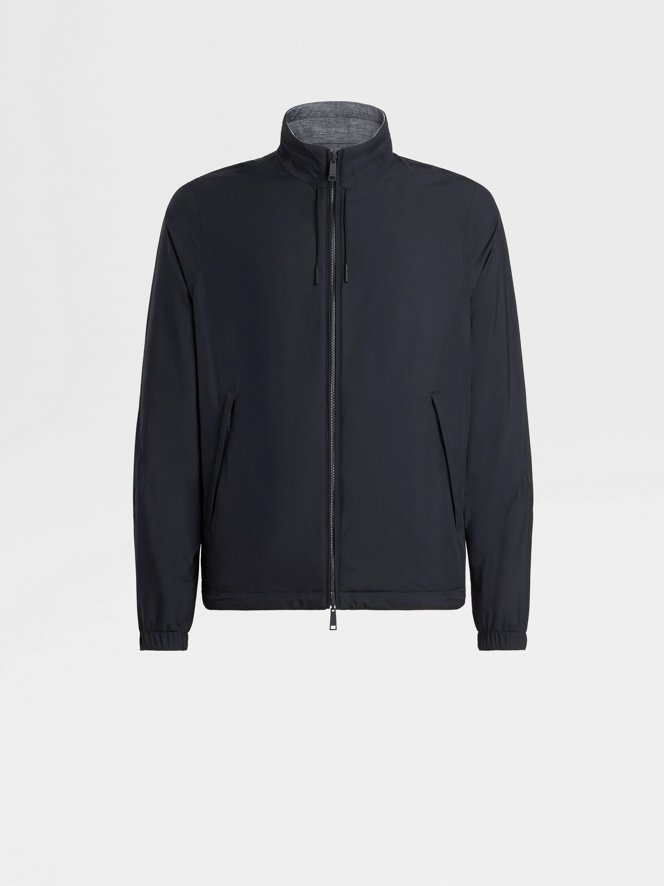 The navy blue and grey technical fabric reversible Brezza blouson is lightweight and versatile. INFO The navy blue and grey technical fabric reversible Brezza blouson combines sleek, urban style with functional design. Choose between the microfiber and cashmere blend jersey sides to complement different looks. The water-repellent jacket is styled with a stand collar and adjustable hem to block out the wind, while leather details add polish wherever you go. PRODUCT CODE E7T33-7124B-534 MATERIALS AND CARE Main body: 100% Polyester Leather details: Calfskin Do not wash. Do not bleach. Do not tumble dry. Iron at max 110°C. Professional dry cleaning in hydrocarbons, mild process. Professional leather clean only. Protect leather details before washing. Protect metal accessories during washing. FIT AND PRODUCT DETAILS • Side A: microfiber • Side B: cashmere blend jersey • Regular fit • Stand collar • Zip closure • Adjustable hem • Elasticated cuffs • Zegna Logo • Leather drawstring • Welt pockets • Water-repellent • 66 cm length on size 48