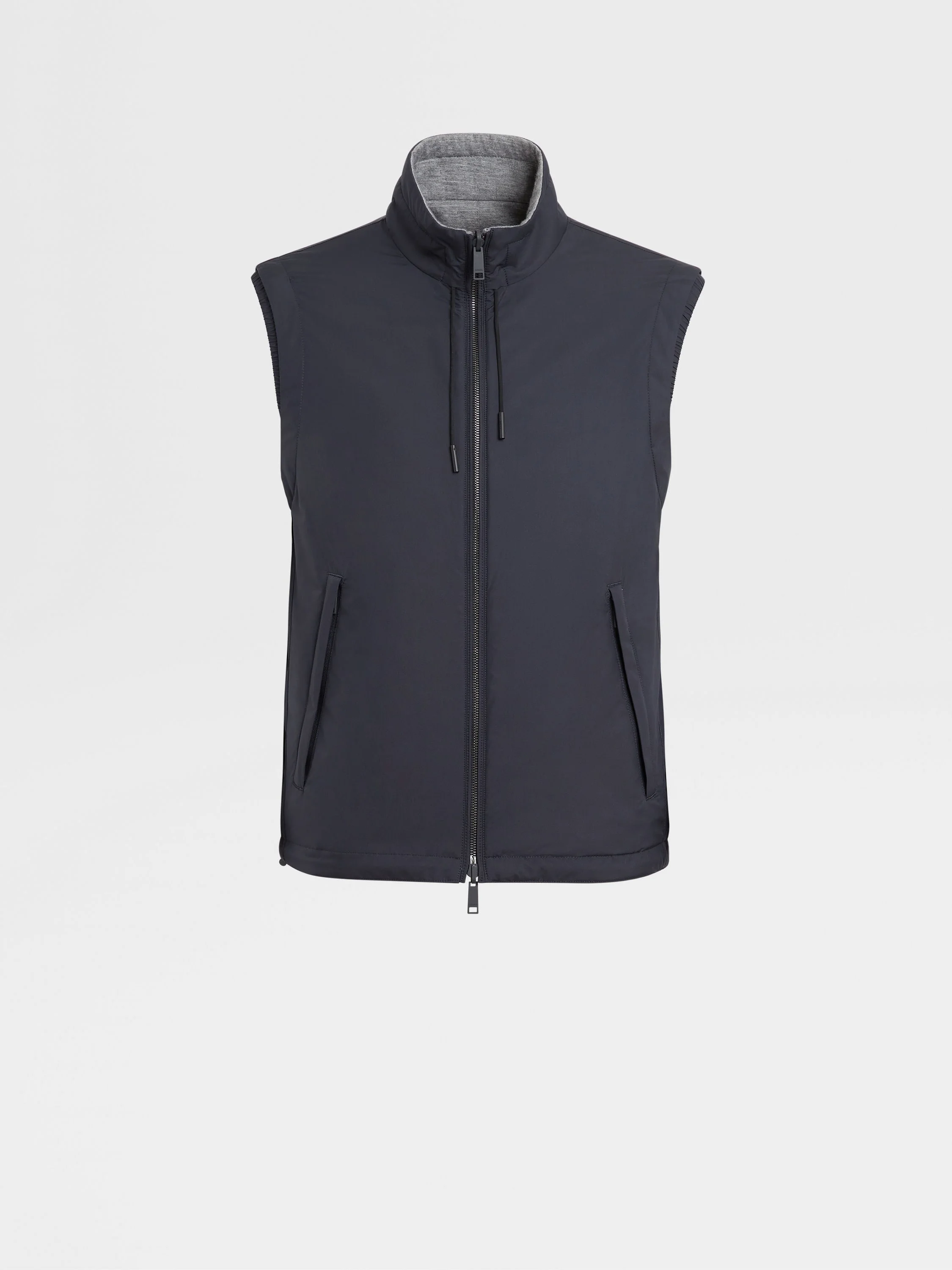 The lightweight, navy blue and grey technical fabric reversible Brezza vest is ready for any adventure. INFO The navy blue and grey technical fabric reversible Brezza vest is lightweight and effortless. Choose between the microfiber and cashmere blend jersey sides to complement different looks. The water-repellent jacket is styled with a stand collar and adjustable hem to block out the wind. The elegant colors are set off with a leather drawstring for an extra boost of style. PRODUCT CODE E7T33-7110B-534 MATERIALS AND CARE Main body: 100% Polyester Leather details: Calfskin Do not wash. Do not bleach. Do not tumble dry. Iron at max 110°C. Professional dry cleaning in hydrocarbons, mild process. Professional leather clean only. Protect leather details before washing. Protect metal accessories during washing. FIT AND PRODUCT DETAILS • Side A: microfiber • Side B: cashmere blend jersey • Regular fit • Stand collar • Zip closure • Adjustable hem • Zegna Logo • Leather drawstring • Welt pockets • Water-repellent • 64 cm length on size 48