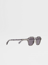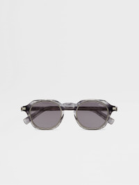Crafted from acetate with titanium details, these transparent grey sunglasses bring contemporary elegance to the everyday. INFO These transparent grey sunglasses enrich a classic acetate construction with sleek titanium nosepads and inner rims. Standing out with a distinctive geometric silhouette, they feature grey lenses for a streamlined look and high-grip paddle tips for enhanced comfort. ZEGNA's 232 Road Brand Mark wraps around the hinge for a signature touch. PRODUCT CODE EZ0286-4720A MATERIALS AND CARE Acetate; Titanium Clean your eyewear using a soft cloth, preferably microfiber, with water or a mild detergent. To avoid scratching the lenses, never use paper towels or clothing to clean your eyewear. Do not use household detergents or soaps to clean your eyewear; these products will damage the lenses over time. FIT AND PRODUCT DETAILS • Lens 47 mm – Bridge 23 mm – Temple 145 mm • Base 2 • Finishing: shiny • Not suitable for mounting prescription lenses • Single bridge • Grey lenses • Grip paddle on the end of the temples • Titanium nosepads and inner rims • Palladium ZEGNA 232 Road Brand Mark on the temples as a corner detail • ZEGNA Logo on the lens and on the inner side of the temples