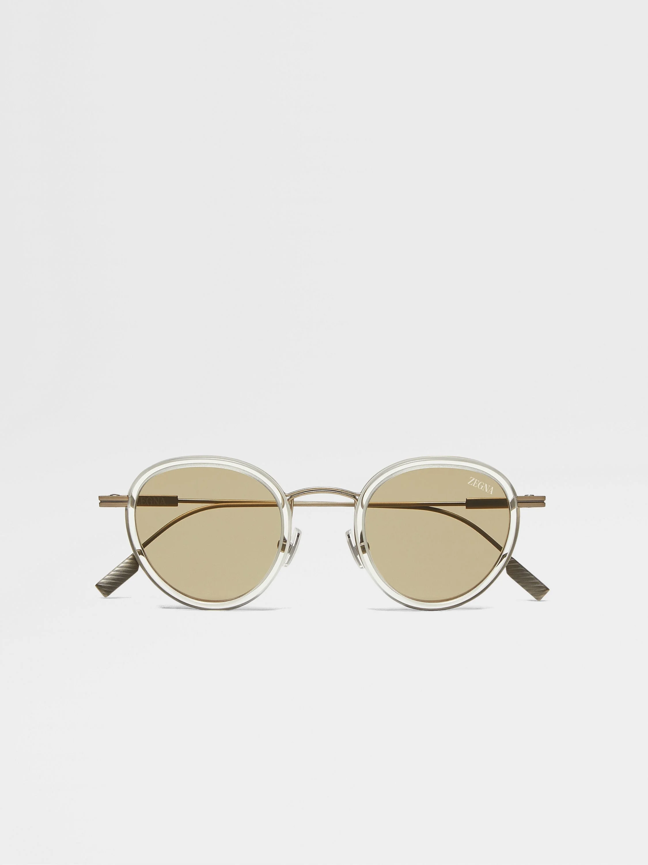 Sleek titanium lets the clean silhouette of these transparent yellow sunglasses do all the talking. INFO These transparent yellow sunglasses deliver lightweight comfort with a special construction that draws on the noble properties of flexible titanium: thin metal wire wraps around square-cut acetate with soft rounded volumes. Adjustable nose pads and grip paddles on the temple tips ensure a secure fit, whilst our iconic 232 Road Brand Mark signs off the looks with Zegna's signature elegance. PRODUCT CODE EZ0276-4639E MATERIALS AND CARE Titanium; Acetate Clean your eyewear using a soft cloth, preferably microfiber, with water or a mild detergent. To avoid scratching the lenses, never use paper towels or clothing to clean your eyewear. Do not use household detergents or soaps to clean your eyewear; these products will damage the lenses over time. FIT AND PRODUCT DETAILS • Lens 46 mm – Bridge 23 mm – Temple 145 mm • Base 2 • Finishing: shiny • Single bridge • Laser-inscribed Zegna Logo on the inside of the temple and on the lens • Zegna 232 Road Brand Mark on the temples • Adjustable nose pads