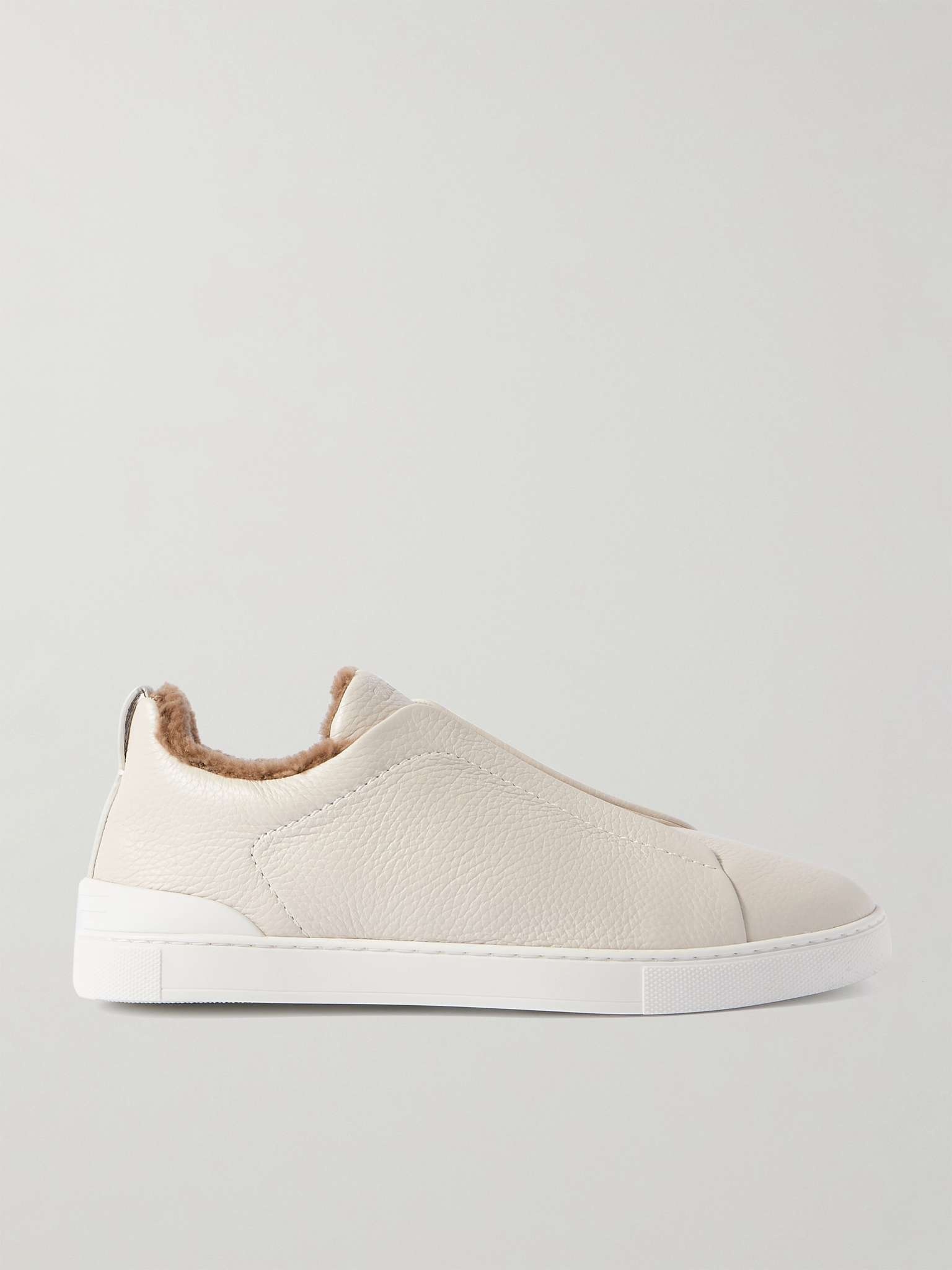 Crafted in Italy from full-grain leather and lined in plush shearling, this version of ZEGNA's recognisable sneakers is both streamlined and cosy. They have elasticated inserts to make them easy to get on and off and signature 'Triple Stitch™' embossing at the heels. Size & Fit - Fits true to size. Take your normal size - UK sizing Details & Care - Off-white textured-leather (Deer) - Style number: LHCLN S4668Z