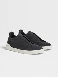 The dark grey Oasi Cashmere Triple Stitch™ sneakers offer a softer take on a casual silhouette. INFO Enhanced with nubuck details, the dark grey Oasi Cashmere Triple Stitch™ sneakers pair two luxurious materials in one sleek design. The brand’s signature triple-crossed elastic detail ensures an easy slip-on fit, while evoking the traditional hand-stitching of tailored jackets to symbolize and honor Zegna’s legacy of fine craftsmanship. The lightweight uppers are mounted on a white rubber sole. The Triple Stitch™ Oasi Cashmere Shoes were Born in Oasi Zegna: the home of our values in the Italian Alps. Our first shoe to be crafted with an upper of Oasi Cashmere — the fibres of which we commit to certifying as 100% traceable from 2024 — the impeccably soft style is hallmarked a trio of crosses inspired by the handmade stitches on our Jackets. PRODUCT CODE LHPTW-S5996Z-CRB MATERIALS AND CARE Cashmere; Cotton; Calf Leather The inspiration behind this Oasi Cashmere Collection garment was Born in Oasi Zegna, a 100km² natural territory and the home of our values. It's crafted from Oasi Cashmere fibres, which ZEGNA commits to certifying as traceable from 2024. The Oasi Cashmere Collection follows in the footsteps of our founder, who envisioned a vertically integrated system of producing textiles. Washing by hand with light soap and cold water yields the best results. Remove the insoles, wash separately and air dry. Do not use hot water, a hot dryer, or expose the shoes to high heat. FIT AND PRODUCT DETAILS • Crossed elastics • Tonal cashmere lining • Sanitized® removable footbed • White rubber sole • Zegna 232 Road Brand Mark on the heel tab • Made in Italy • Comes with a shoe bag We want every pair of Triple Stitch™ sneakers to fit perfectly anytime, anywhere, anyplace. To find your perfect fit, we recommend going down a half-size compared to your usual shoe size. Please note that Zegna uses UK sizing. For further information, please contact us via our customer service channels or by visiting the nearest Zegna flagship store.