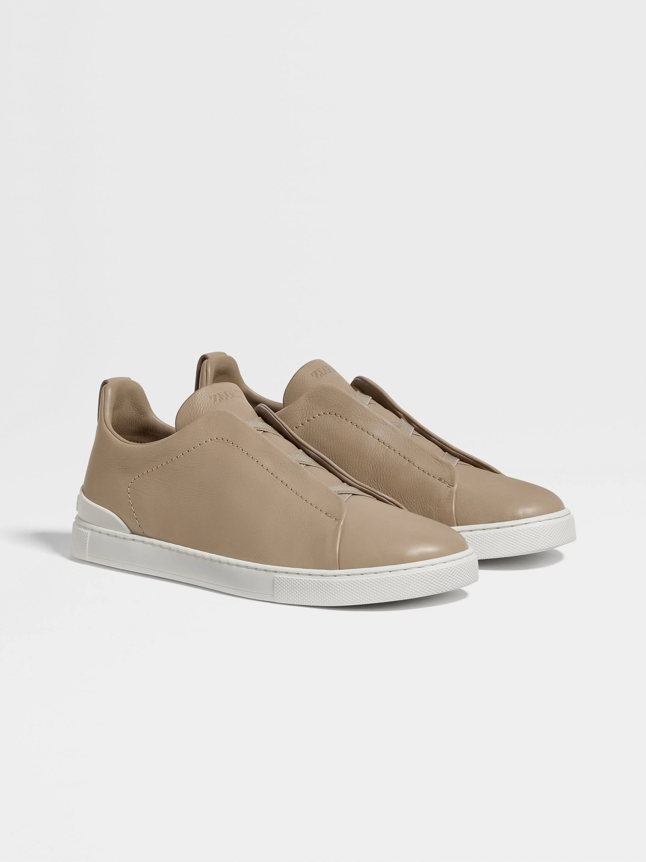 The light taupe Triple Stitch™ SECONDSKIN sneakers are made from feather-light calf leather. INFO Designed to mold to the foot with a glove-like fit, the light taupe Triple Stitch™ SECONDSKIN sneakers take Zegna's casual footwear to the new levels of comfort. The brand’s signature triple-crossed elastic detail ensures an easy slip-on fit, while evoking the traditional hand-stitching of tailored jackets to symbolize and honor Zegna’s legacy of fine craftsmanship. The low top sneakers are lined with light brown wool and mounted on a white rubber sole for a high-contrast look. The Triple Stitch™ SECONDSKIN shoes are the result of more than a century of generational craftsmanship, the sharing of wisdom, and dedication to innovation. Crafted from our SECONDSKIN leather, which ensures a glove-like fit, they are ideal for travelling in exceptional style and comfort. The nubuck edition has a soft, supple touch with a velvet-like finish for textural difference. PRODUCT CODE LHOLA-S7005Z-PIC MATERIALS AND CARE Calf Leather SECONDSKIN is crafted by tanneries selected for their renowned expertise. Fine, supple and incredibly soft to the touch, it moulds to your proportions over time — offering impeccable comfort with each wear. Clean with a soft cloth. Maintain the leather's glossy appearance by applying a small dab of polish and distributing it uniformly over the surface with a soft cloth. Let dry for a few minutes, then vigorously shine with clean, soft cloth. Avoid contact with abrasives, including hard-bristled brushes, and substances containing alcohol, such as perfumes, solvents, etc. In case of contact with water, it is important to let the footwear dry completely before cleaning. Store in the included dust bag in a cool, dry place. To preserve the quality of your Triple Stitch™ SECONDSKIN, we recommend using our exclusive Care Kit. FIT AND PRODUCT DETAILS • Crossed elastics • Light brown wool lining • Sanitized® removable footbed • White rubber sole • Zegna 232 Road Brand Mark on the heel tab • Made in Italy • Comes with a shoe bag We want every pair of Triple Stitch™ sneakers to fit perfectly anytime, anywhere, anyplace. To find your perfect fit, we recommend going down a half-size compared to your usual shoe size. Please note that Zegna uses UK sizing. For further information, please contact us via our customer service channels or by visiting the nearest Zegna flagship store.