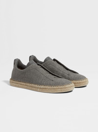 Choose casual elegance in these grey melange Triple Stitch™ espadrilles, made from viscose, linen and leather. INFO These grey melange Triple Stitch™ espadrilles exude warm-weather elegance with their viscose-linen construction and natural rope sole. Their distinctive silhouette is elevated with the secure embrace of the ZEGNA icon's signature triple-crossed elastics. The Triple Stitch™ Shoes are an icon of ZEGNA's contemporary wardrobe offering. Hallmarked with a namesake trio of crosses — inspired by the handmade stitches found on our tailoring — the comfortable slip-on style is available in an array of refined materials and set on a lightweight, flexible sole. PRODUCT CODE LHOLC-S8021Z-GME MATERIALS AND CARE Viscose; Linen; Calf Leather Clean with a soft cloth. Avoid contact with abrasives, water and substances containing alcohol, such as perfumes, solvents, etc. In case of contact with water, it is important to let the footwear dry completely before cleaning. Clean the rubber soles with a product specifically designed for cleaning rubber. Store in the included dust bag in a cool, dry place. To preserve the quality of your Triple Stitch™, we recommend using our exclusive Care Kit. FIT AND PRODUCT DETAILS • Crossed elastics • Sanitized® removable footbed • Natural rope sole • Rubber outsole • Made in Italy • Comes with a shoe bag We want every pair of Triple Stitch™ sneakers to fit perfectly anytime, anywhere, anyplace. To find your perfect fit, we recommend going down a half-size compared to your usual shoe size. Please note that ZEGNA uses UK sizing. For further information, please contact us via our customer service channels or by visiting the nearest ZEGNA flagship store.