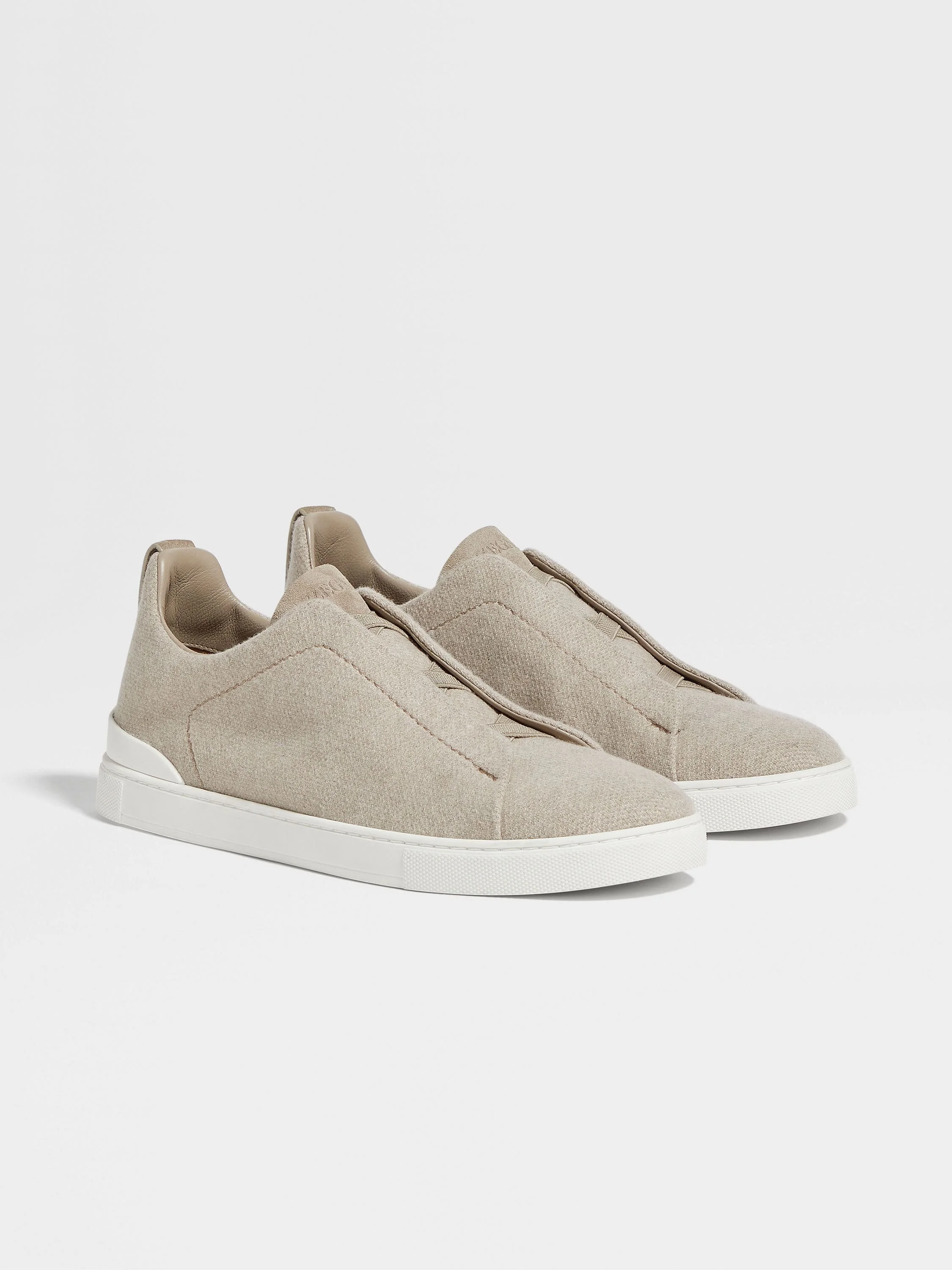 The light taupe cashmere Triple Stitch™ sneakers offer a softer take on a casual silhouette. INFO Enhanced with nubuck details, the light taupe cashmere Triple Stitch™ sneakers pair two luxurious materials in one sleek design. The brand’s signature triple-crossed elastic detail ensures an easy slip-on fit, while evoking the traditional hand-stitching of tailored jackets to symbolize and honor Zegna’s legacy of fine craftsmanship. The lightweight uppers are mounted on a white rubber sole. The Triple Stitch™ Shoes are an icon of ZEGNA's contemporary wardrobe offering. Hallmarked with a namesake trio of crosses — inspired by the handmade stitches found on our Jackets — the comfortable slip-on style is available in an array of refined materials and set on a lightweight, flexible sole. PRODUCT CODE LHPTW-S5996Z-PIC MATERIALS AND CARE Cashmere; Cotton; Calf Leather Washing by hand with light soap and cold water yields the best results. Remove the insoles, wash separately and air dry. Do not use hot water, a hot dryer, or expose the shoes to high heat. FIT AND PRODUCT DETAILS • Crossed elastics • Tonal cashmere lining • Sanitized® removable footbed • White rubber sole • Zegna 232 Road Brand Mark on the heel tab • Made in Italy • Comes with a shoe bag We want every pair of Triple Stitch™ sneakers to fit perfectly anytime, anywhere, anyplace. To find your perfect fit, we recommend going down a half-size compared to your usual shoe size. Please note that Zegna uses UK sizing. For further information, please contact us via our customer service channels or by visiting the nearest Zegna flagship store.