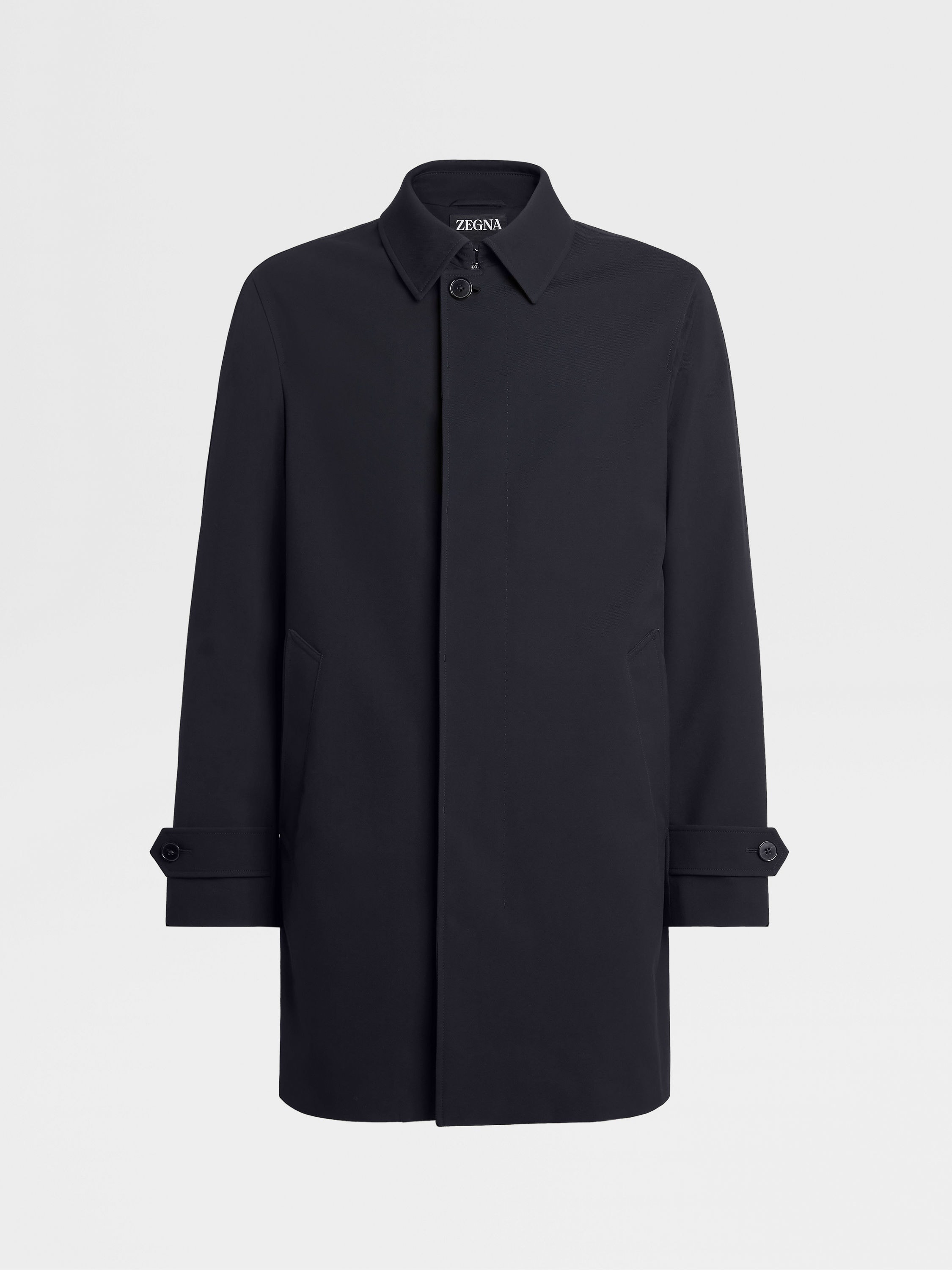 Revitalizing a menswear classic, Zegna presents the navy blue Trofeo™ Elements trench coat. INFO Thanks to its innovative membrane, superfine and water-resistant Trofeo™ Elements wool is the perfect match for the navy blue trench coat. This iconic design is a timeless choice of outerwear for sophisticated urban style. Leather details add an extra boost of edge. PRODUCT CODE E7T23-7300-532 MATERIALS AND CARE Main body: 100% Wool Lining: 100% Cupro Leather details: 100% Calfskin Padding: 100% Cotton This luxurious garment features an innovative membrane specifically developed for superfine fabrics to ensure increased water resistance without compromising the natural softness and weightless feeling of the sophisticated material. Mild dry clean with hydrocarbon solvents. Do not bleach. Do not tumble dry. Regular ironing, steam or dry, may be performed at low setting (110°C / 230°F). FIT AND PRODUCT DETAILS • Fits true to size • Shirt collar • Open bottom • Button closure • Leather details • Water repellent • 90 cm length on size M • Model is 187 cm tall (6.1 feet) and wears an Italian size 48.