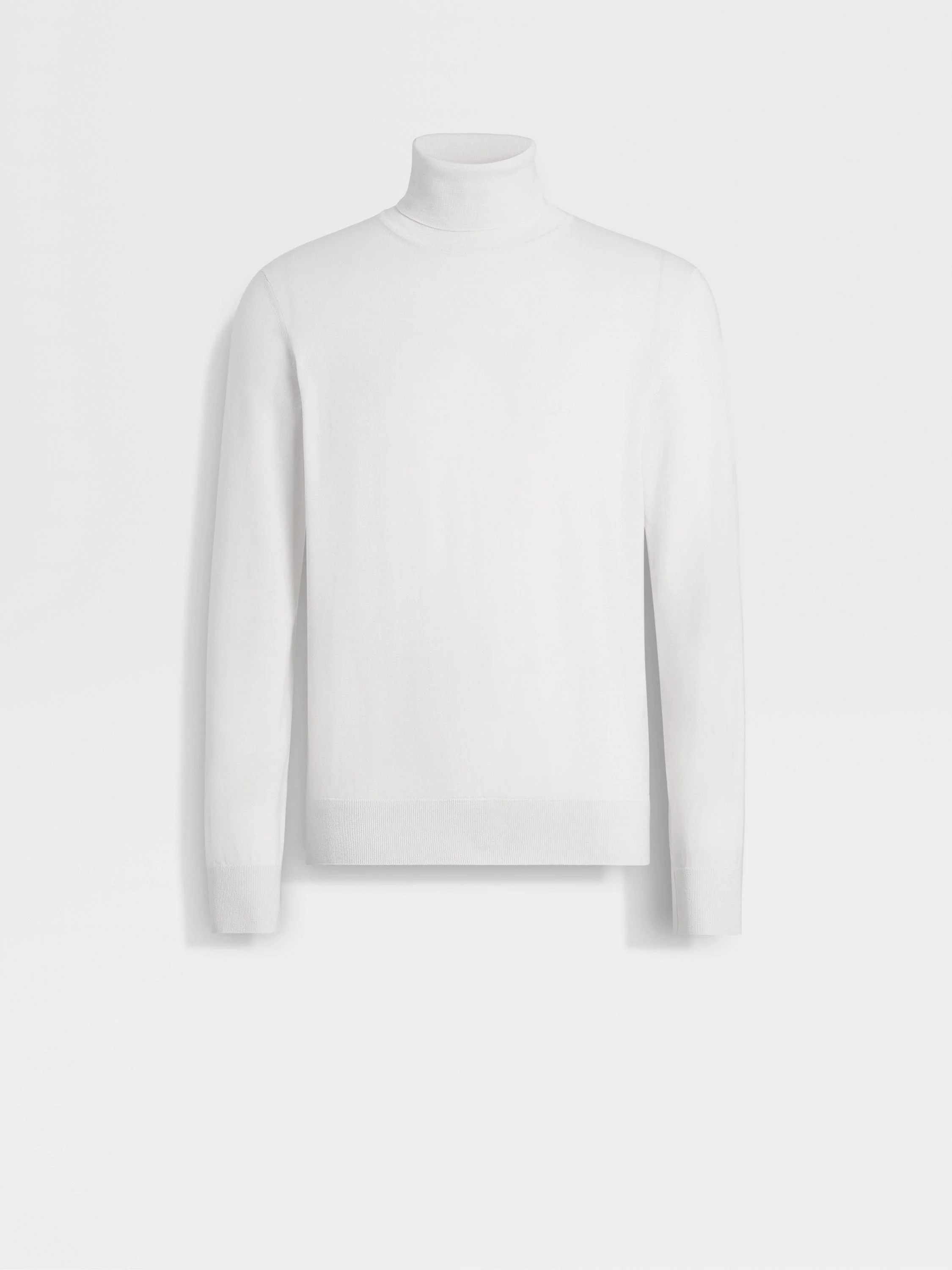 The white Cashseta turtleneck brings together the best of cashmere and silk. INFO Zegna's refined blend of luxury fibers lends the white Cashseta turtleneck its distinctive finish. This special material is yarn-dyed, creating subtle variations in each garment. A staple of sophisticated wardrobes, the turtleneck creates a sleek silhouette. PRODUCT CODE UEJ00A8-120-N91 MATERIALS AND CARE 70% Cashmere; 30% Mulberry Silk This sophisticated fabric combines the softness of cashmere with the smooth finish of fine silk. The yarns of Cashseta are dyed before the fabric is created, resulting in a melange that is unique to each garment. Wash by hand. Do not bleach. Do not tumble dry. Flat drying. Iron at max 110°C. Professional dry cleaning in hydrocarbons, mild process. Wash and iron inside out. FIT AND PRODUCT DETAILS • 18 gauge • Ribbed turtleneck collar • Long sleeves • Ribbed trims