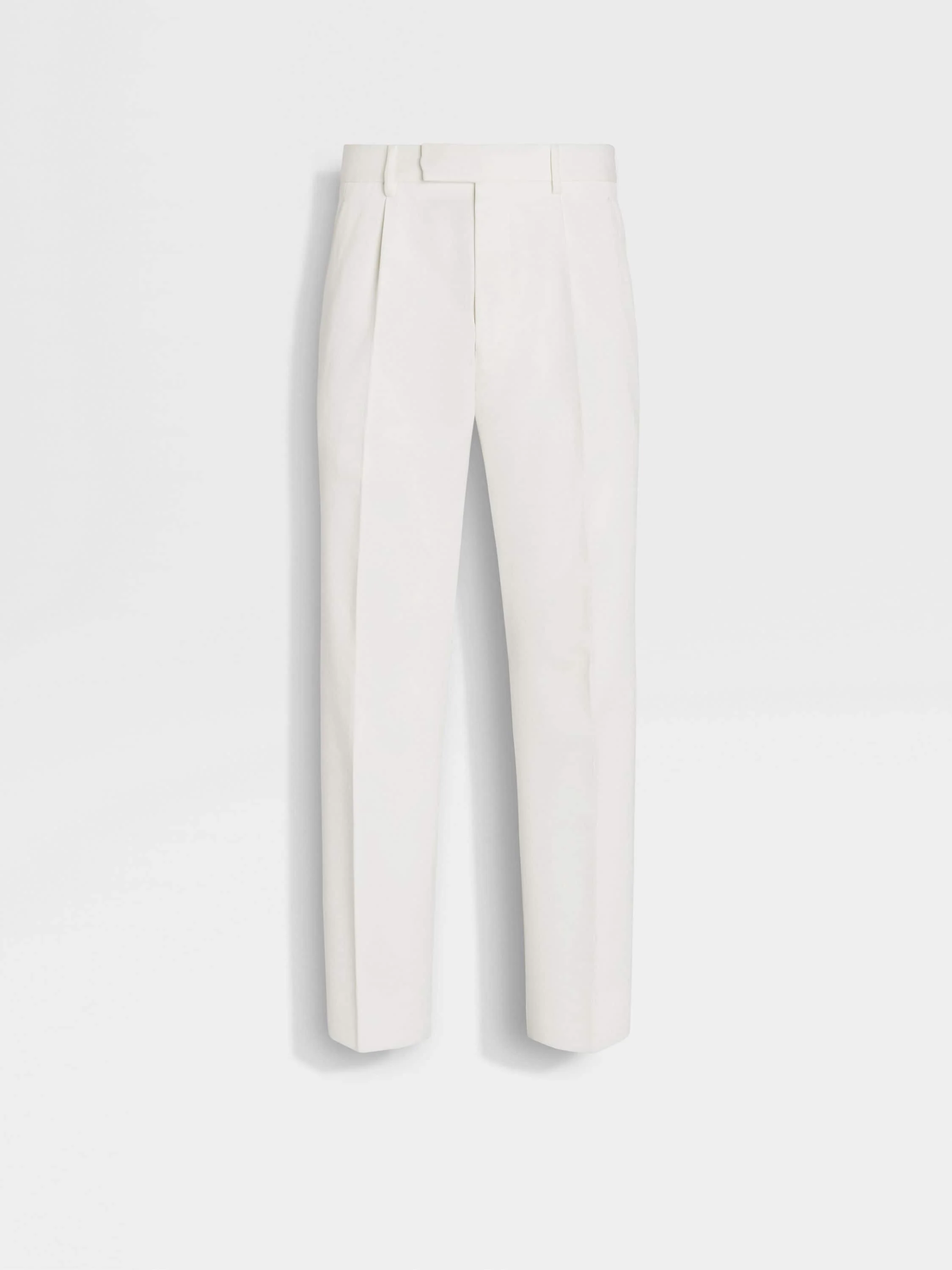 The white cotton and wool pants are a sophisticated everyday staple. INFO Styled with a crisp pleat in the front, the white cotton and wool pants are made from a lightweight blend of natural materials. Soft and breathable, they hold their shape throughout busy days. The pants have slanted pockets and a welt pocket on the back. PRODUCT CODE UEI04A8-TP45-N01 MATERIALS AND CARE Main body: 57% Cotton; 43% Wool Lining: 100% Cotton Do not wash. Do not bleach. Do not tumble dry. Iron at max 110°C. Professional dry cleaning in hydrocarbons, mild process. Wash inside out. FIT AND PRODUCT DETAILS • Pleated fit • 19.5 open hem • Zip and button closure • Slanted pockets and back welt pocket