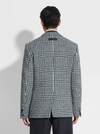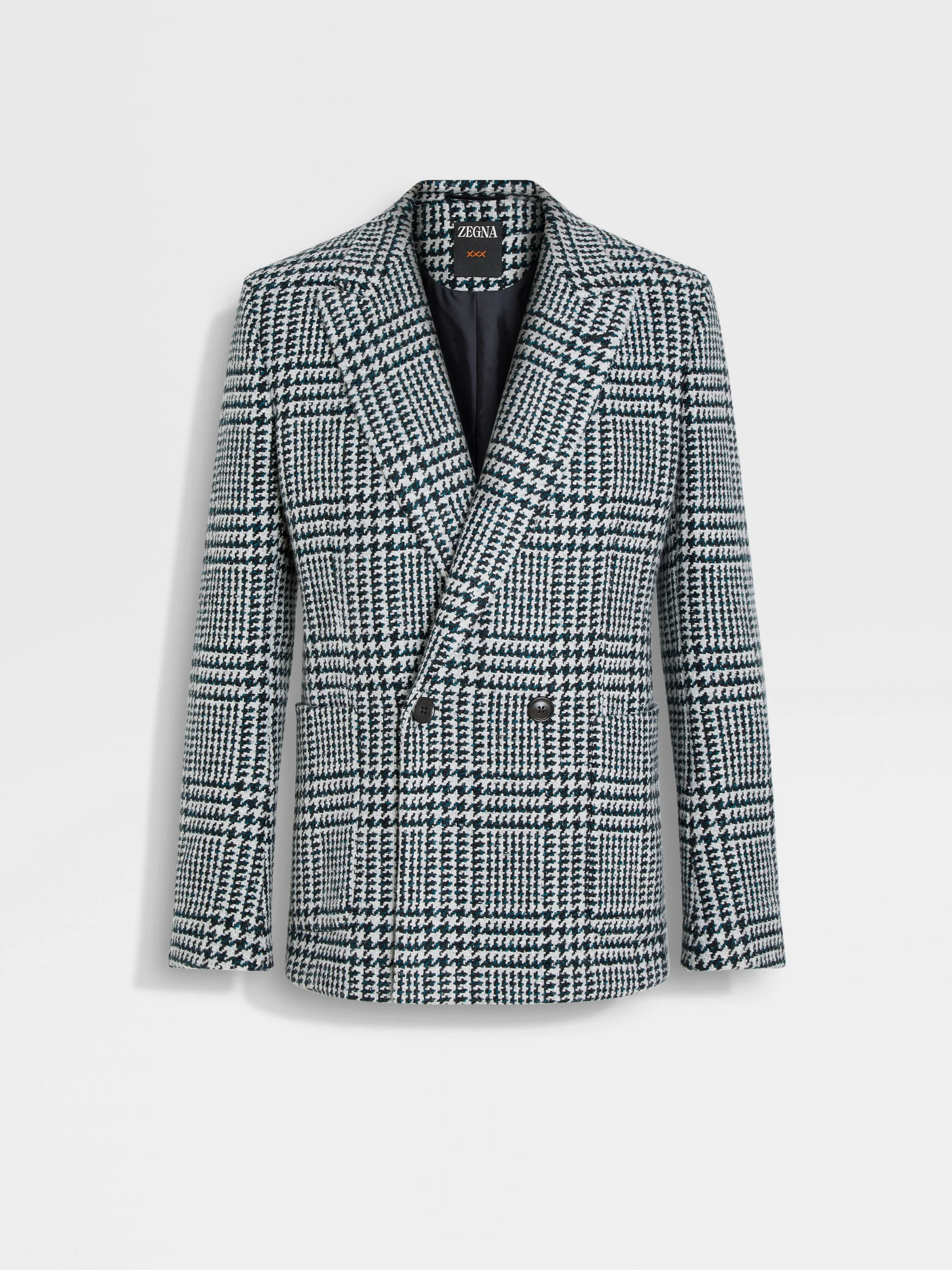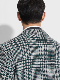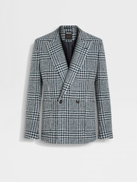 A wool-cashmere blend with a white, dark green and black Prince of Wales pattern: this jacket is sartorial perfection. INFO Made from an exquisitely soft blend of wool and cashmere, this jacket exudes timeless appeal with a Prince of Wales pattern in a charming palette of white, dark green and black. Its double-breasted silhouette is elevated with dapper peak lapels, patch pockets and sleek leather accents. PRODUCT CODE 287046A2-112DH0 MATERIALS AND CARE Main body: 90% Wool; 10% Cashmere Leather details: Calfskin Do not wash. Do not bleach. Do not tumble dry. Iron at max 110°C. Professional dry cleaning in tetrachloroethene and hydrocarbons, mild process. FIT AND PRODUCT DETAILS • Regular fit • Tailoring jacket • Double breast • Peak lapels • Single vent • Leather details • Prince of Wales pattern • Button closure • Patch pockets • Canvas construction • Lined • 76 cm length on size 48