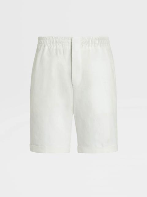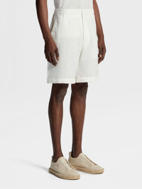 The white pure linen shorts feel airy and lightweight. INFO Thanks to their naturally breathable material, the white pure linen shorts are the perfect choice for casual outings. The shorts are cuffed with a simple, folded hem. A drawstring completes the relaxed silhouette. PRODUCT CODE UCI31A6-TB12-997 MATERIALS AND CARE Main body: 100% Linen Lining: 100% Cupro Do not wash. Do not bleach. Do not tumble dry. Iron at max 110°C. Professional dry cleaning in hydrocarbons, mild process. Wash inside out. FIT AND PRODUCT DETAILS • Regular fit • 30 cm folded hem • Drawstring, button and zip closure • Side slanted pockets • Back flap patch pockets • Cupro lining • Model is 186 cm tall (6.1 feet) and wears an Italian size 48.
