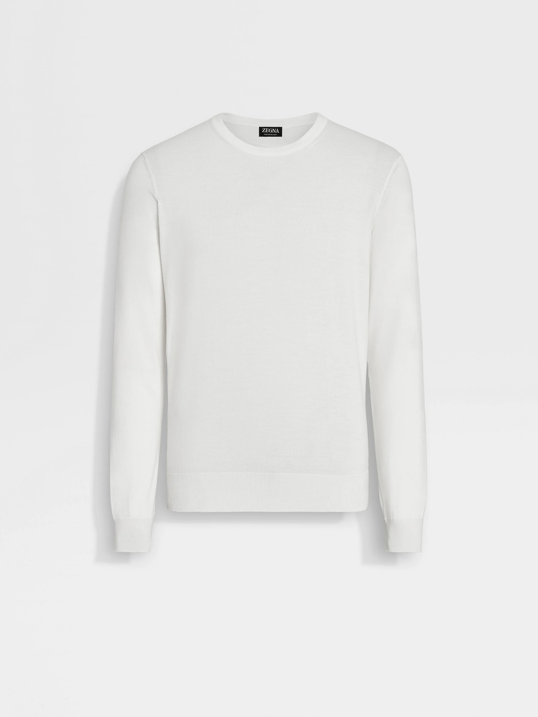 The white mélange Cashseta crewneck brings together cashmere and silk. INFO Zegna's refined blend of cashmere and silk lends the white mélange Cashseta crewneck its distinctive finish. The natural knit feels soft against the skin, elevating a simple design into a luxurious essential. The classic ribbed collar and trims complete the look. Customize this item with our Made to Measure Service. For more information, please contact our Customer Care or visit your nearest stores. PRODUCT CODE E8J00-110-N91 MATERIALS AND CARE 70% Cashmere; 30% Mulberry Silk This sophisticated fabric combines the softness of cashmere with the smooth finish of fine silk. The yarns of Cashseta are dyed before the fabric is created, resulting in a mélange that is unique to each garment. Do not wash. Do not bleach. Do not tumble dry. Iron at max 110°C. Professional dry cleaning in hydrocarbons. FIT AND PRODUCT DETAILS • 18 gauge • Ribbed crewneck collar • Long sleeves • Ribbed hem and cuffs • Regular fit • Model is 188 cm tall (6.2 feet) and wears an Italian size 48.