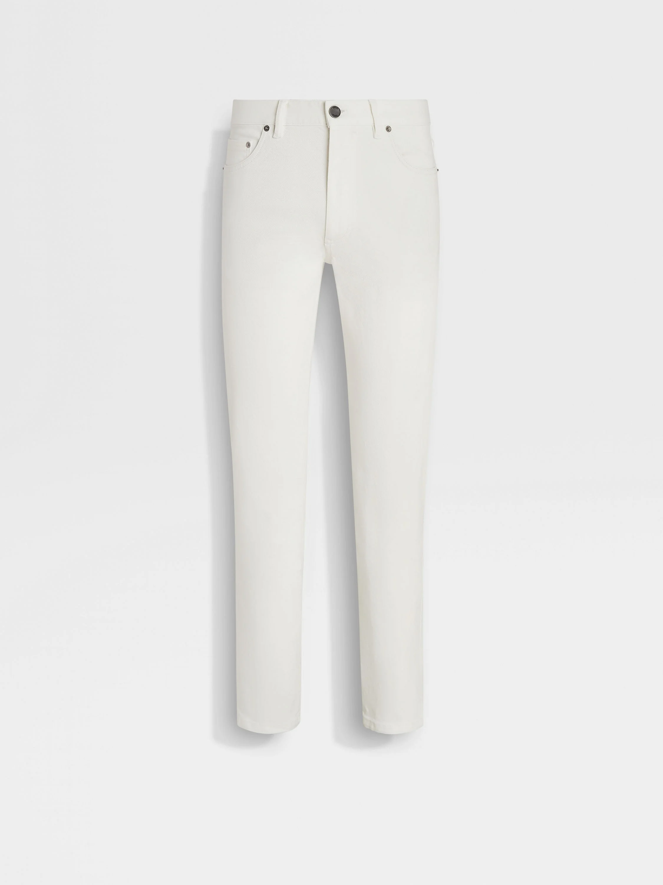 The white rinse-washed cotton Roccia jeans are enhanced with a touch of elasticity. INFO Thanks to their crisp finish and comfortable fit, the white rinse-washed stretch cotton Roccia jeans are perfect for elevated casual style. The slim cut elongates the legs, in line with Zegna's vision of dynamic, contemporary menswear. ROCCIA ('rɔt:ʃa) — ITALIAN FOR 'ROCK' The inspiration for the Roccia Trousers was Born in Oasi Zegna — the home of our values in the Italian Alps. Inspired by classic workwear, they're both hardwearing and elegant, making them a reliable foundation to any look. PRODUCT CODE UEL37A8-CITYE-001 MATERIALS AND CARE Main body: 99% Cotton; 1% Elastane Lining: 65% Polyester; 35% Cotton Max washing temp 30°C, mild process. Do not bleach. Do not tumble dry. Line drying in the shade. Iron at max 110°C. Do not dry clean. Wash separately. Wash inside out. FIT AND PRODUCT DETAILS • Slim fit • 17.5 cm narrow hem • Zip and button closure • 5-pocket style • Denim weight: 10.5 ounces