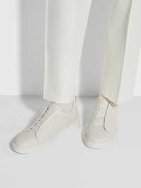 The white Triple Stitch™ SECONDSKIN sneakers perfectly mold to your foot. INFO The white Triple Stitch™ SECONDSKIN sneakers are crafted from specially selected calf leather for even more flexibility. The brand’s signature triple-crossed elastic detail ensures an easy slip-on fit, while evoking the traditional hand-stitching of tailored jackets to symbolize and honor Zegna’s legacy of fine craftsmanship. The super soft, light uppers are complemented by a white rubber sole. The Triple Stitch™ SECONDSKIN shoes are the result of more than a century of generational craftsmanship, the sharing of wisdom, and dedication to innovation. Crafted from our SECONDSKIN leather, which ensures a glove-like fit, they are ideal for travelling in exceptional style and comfort. PRODUCT CODE LHOTA-S5207Z-PAN MATERIALS AND CARE Calf Leather SECONDSKIN is crafted by tanneries selected for their renowned expertise. Fine, supple and incredibly soft to the touch, it offers impeccable comfort with each wear. Clean with a soft cloth. Avoid contact with abrasives, water and substances containing alcohol, such as perfumes, solvents, etc. In case of contact with water, it is important to let the footwear dry completely before cleaning. Clean the rubber soles with a product specifically designed for cleaning rubber. Store in the included dust bag in a cool, dry place. To preserve the quality of your Triple Stitch™ SECONDSKIN, we recommend using our exclusive Care Kit. FIT AND PRODUCT DETAILS • Crossed elastics • Tonal leather lining • Sanitized® removable footbed • White rubber sole • Zegna 232 Road Brand Mark on the heel tab • Made in Italy • Comes with a shoe bag We want every pair of Triple Stitch™ sneakers to fit perfectly anytime, anywhere, anyplace. To find your perfect fit, we recommend going down a half-size compared to your usual shoe size. Please note that Zegna uses UK sizing. For further information, please contact us via our customer service channels or by visiting the nearest Zegna flagship store.
