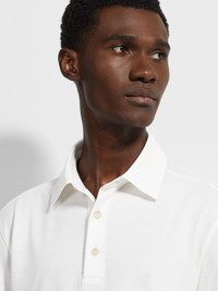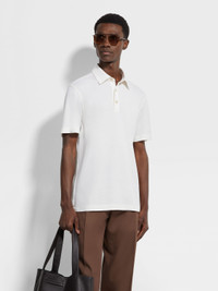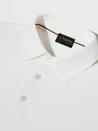 Combining fine wool with timeless design, the white Vellus Aureum polo shirt is a casual icon. INFO The white Vellus Aureum polo shirt redefines casual style with its use of exceptionally fine wool. Its regular fit features short sleeves and a self-fabric polo collar for a clean, classic look. The tubular hem and cuffs provide a smooth finish, while the button closure adds a traditional touch. PRODUCT CODE UFV96A9-FV7VL9-N01 MATERIALS AND CARE 100% Wool Vellus Aureum was inspired by our Founder’s quest for excellence to seek the finest wool in the world. Exquisitely fine in texture and rare, Vellus Aureum is crafted from 100% certified traceable wool fibres. Do not wash. Do not bleach. Do not tumble dry. Iron at max 110°C. Professional dry cleaning in hydrocarbons. Wash and iron inside out. FIT AND PRODUCT DETAILS • Regular fit • Short sleeves • Self fabric polo collar • Tubular hem and cuffs • Button closure
