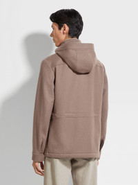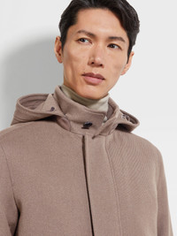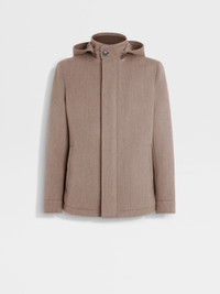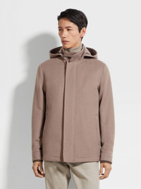 This brown melange jacket combines the best of wool and cashmere. INFO Functional, refined and versatile in equal measure, this brown melange jacket is styled with an adjustable hem and drawstring waist. Crafted from a luxurious blend of wool and cashmere with a water-repellent finish. PRODUCT CODE UGT24A2-G200-M96 MATERIALS AND CARE Main body: 98% Wool; 2% Cashmere Leather details: Calfskin Lining: 89% Wool; 6% Mulberry Silk; 5% Cashmere Do not wash. Do not bleach. Do not tumble dry. Iron at max 110°C. Professional dry cleaning in hydrocarbons, mild process. FIT AND PRODUCT DETAILS • Regular fit • Stand hooded collar • Zip and button closure • Adjustable hem • Leather details • Waist drawstring • Welt pockets • Water repellent • 74 cm length on size 48