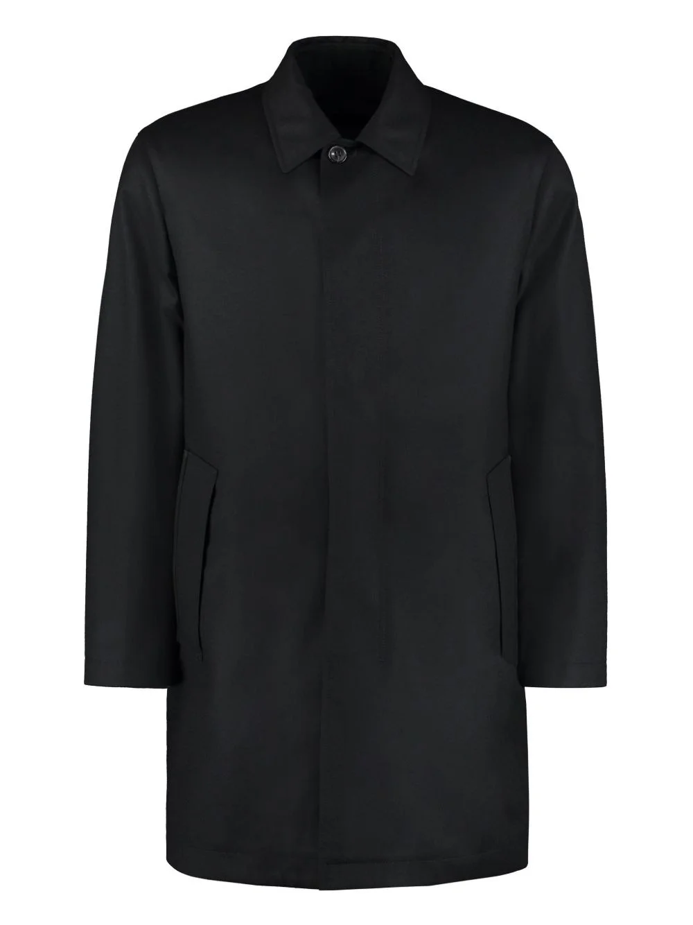 wool coat Highlights - Black - Concealed front button fastening - Two side welt pockets - Long sleeves - Straight hem Made in Italy Composition Lining: Polyester 100% Outer: Wool 100%, Calf Leather 100% Washing instructions Dry Clean Only