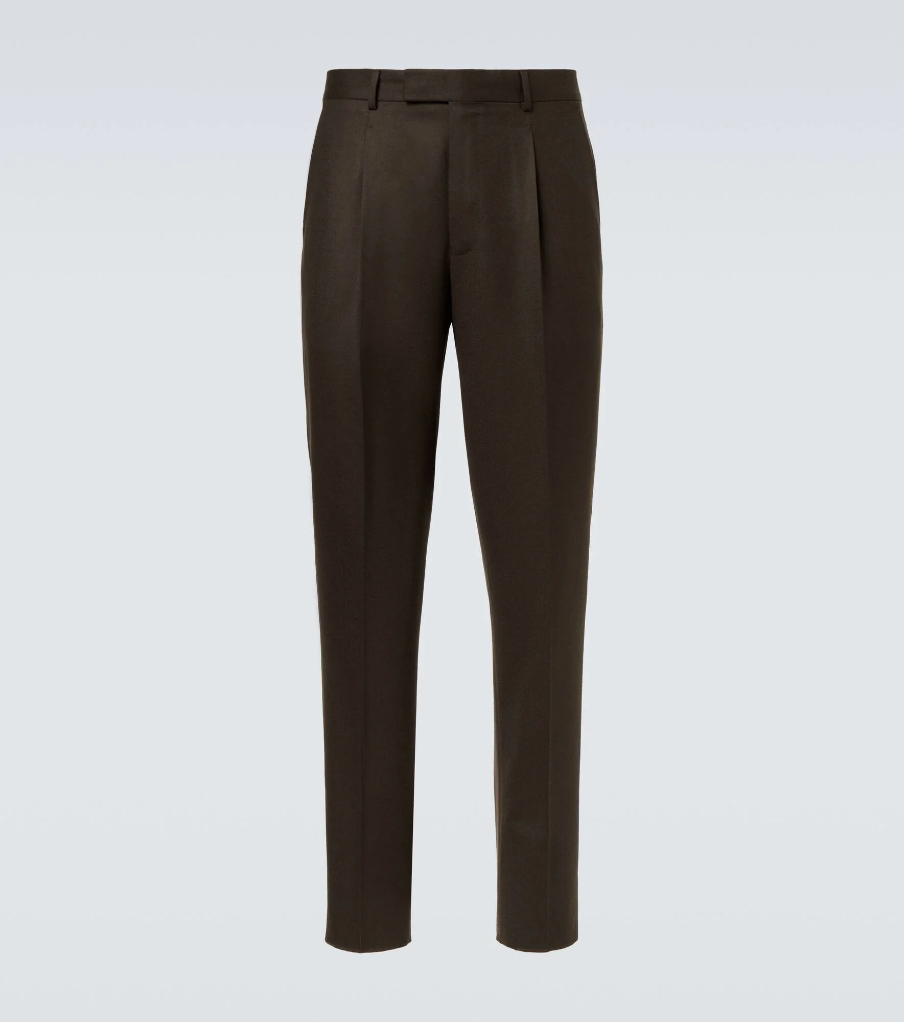 Established with the aim to create the world’s finest fabrics, Zegna is now the go-to brand for luxurious and innovative menswear. Made in Italy from dark brown wool flannel, these pants are a tailored pair cut to a slightly tapered silhouette. Product Details - Material: 100% wool - Care instructions: dry clean - Made in Italy - Designer color name: Dark Brown - Item color: brown - Lining: 100% viscose - Pocket lining: 100% cotton - Contains non-textile parts of animal origin - Closure: zip and button fastening - Pockets: slant pockets, back pockets - Single pleat - Belt loops - Item number: P01057734 Size & Fit - True to size - Non-stretchy fabric - Tapered leg - Unhemmed for tailoring - Height of model is 189cm-74.5" and wears a size 50