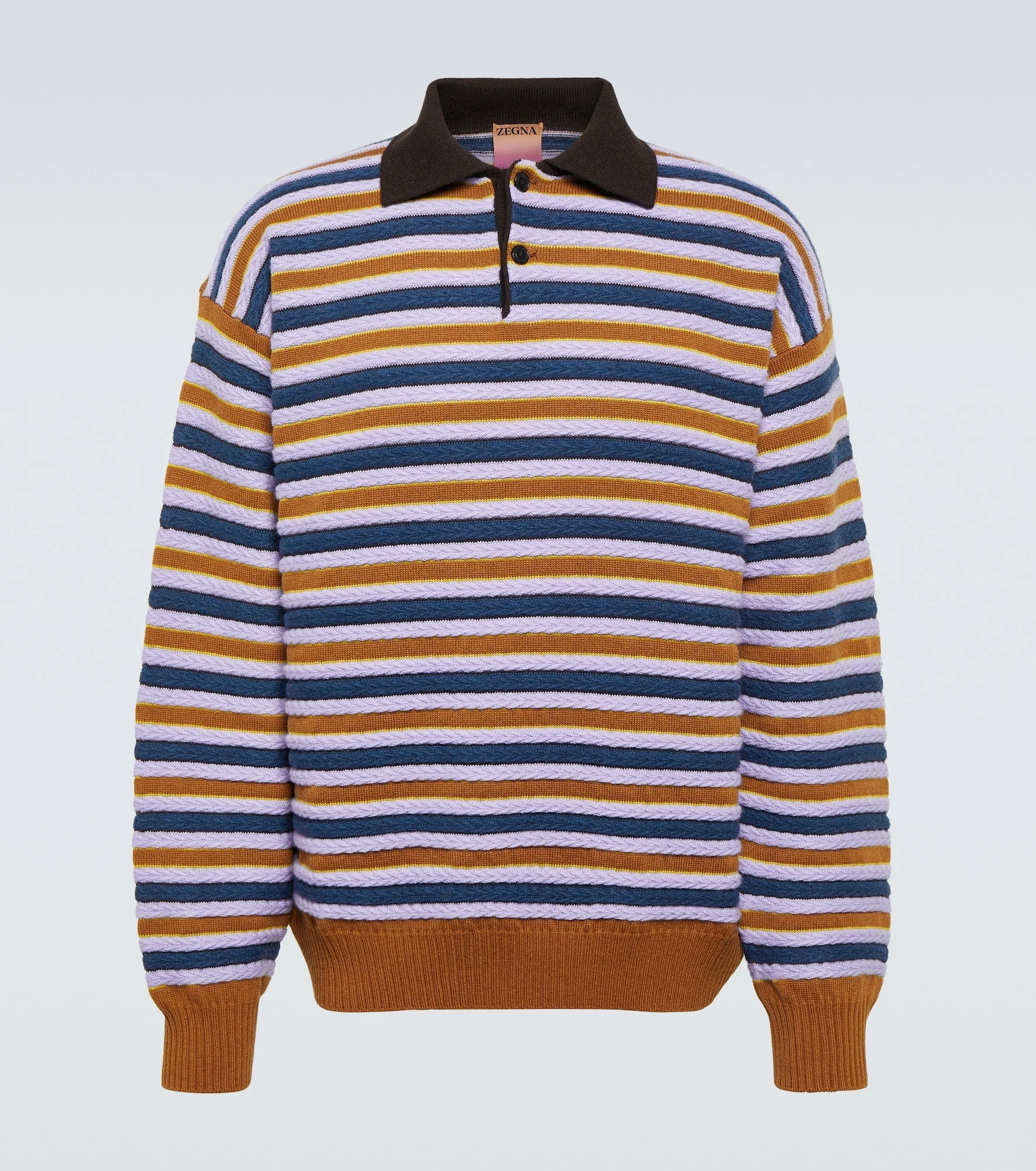 Zegna's fine fabrics mix with The Elder Statesman's signature California-cool spirit in this innovative collaboration. This polo sweater is crafted from a soft blend of cashmere and wool and finished with a multicolored striped motif. Product Details - Material: 74% cashmere, 26% wool - Care instructions: hand wash - Made in Italy - Designer color name: Multicolor - Closure: partially buttoned front - Item number: P00827279 Size & Fit - True to size - Dropped shoulders - Oversized - Mid-weight material - Falls to the hip - The model in the picture is 185cm-6'1" and wearing a size M